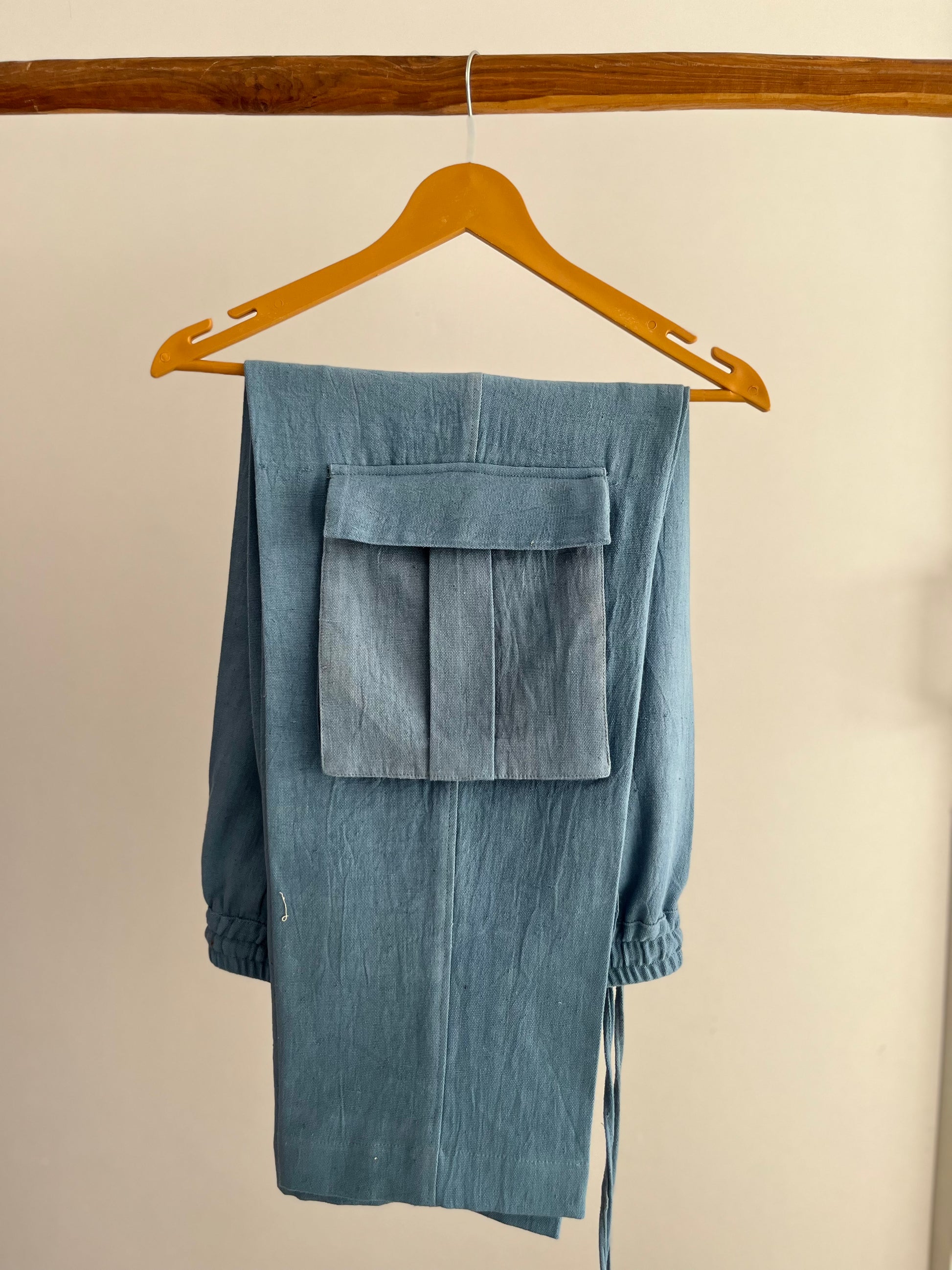- "BlueBliss" is men's trousers crafted from breathable Kala Cotton, in queen blue. It offers both style and sustainability. With an easy elastic waist and handy drawstrings, it's all about your comfort.