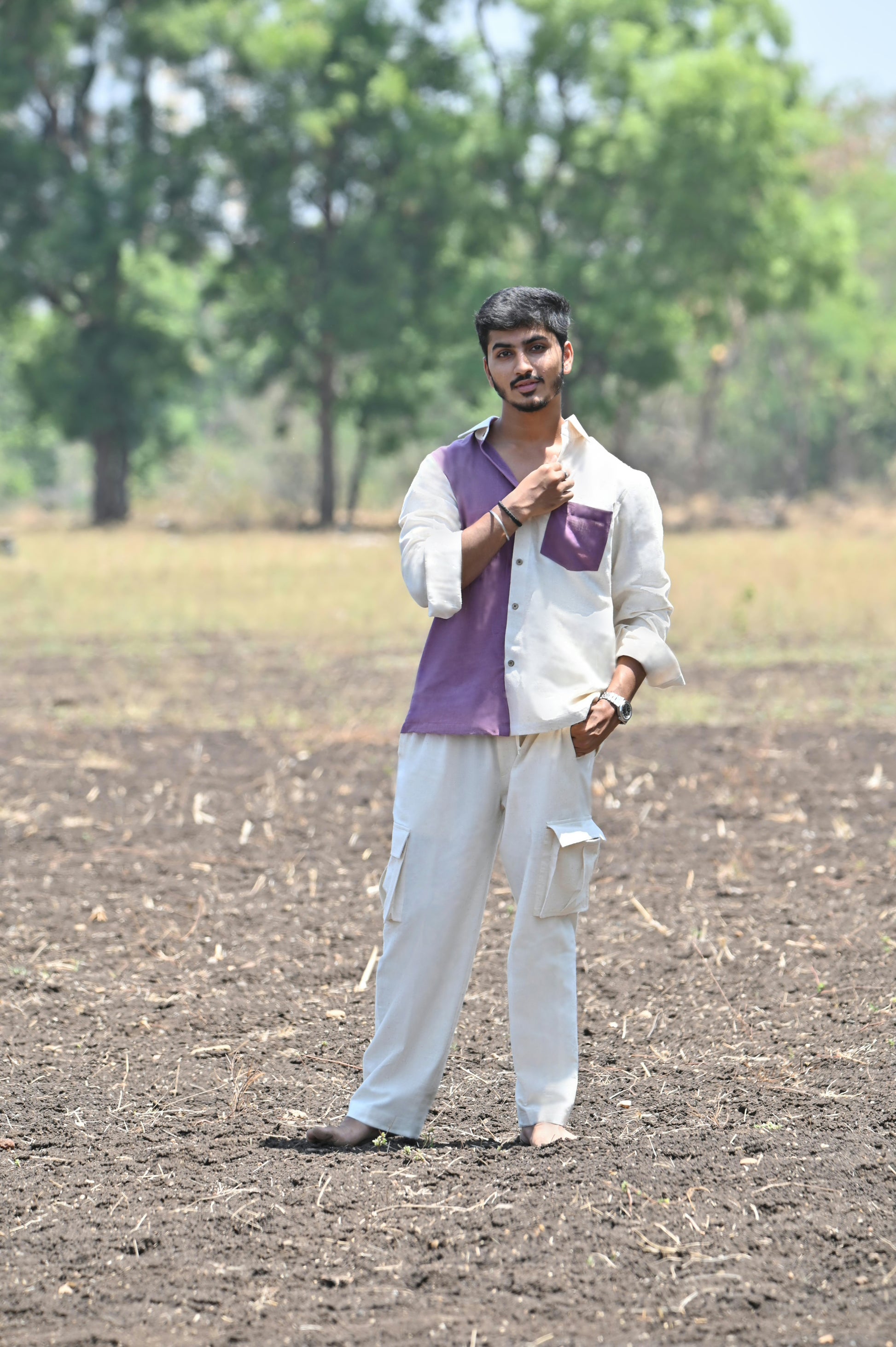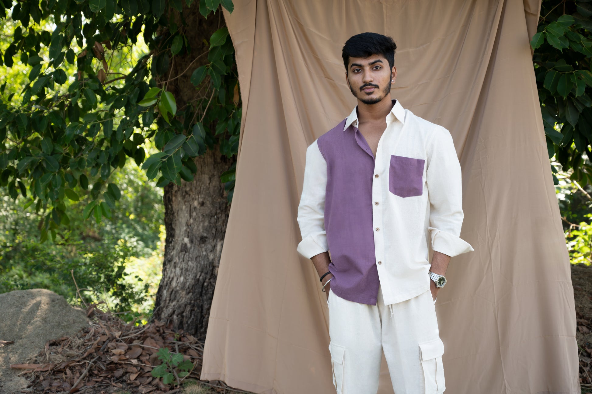 - Crafted from premium Kala Cotton, known for its durability and softness, this shirt ensures a breathable and gentle feel against your skin. The half white, half mauve color scheme adds a touch of modernity and versatility to your ensemble, while the classic collars and buttons radiate timeless elegance. With its full sleeves providing coverage and a convenient pocket for added functionality, this shirt seamlessly combines style with practicality. This shirt is a go-to choice for any casual outings and trips.It effortlessly blends grace and chic, offering a refined aesthetic.