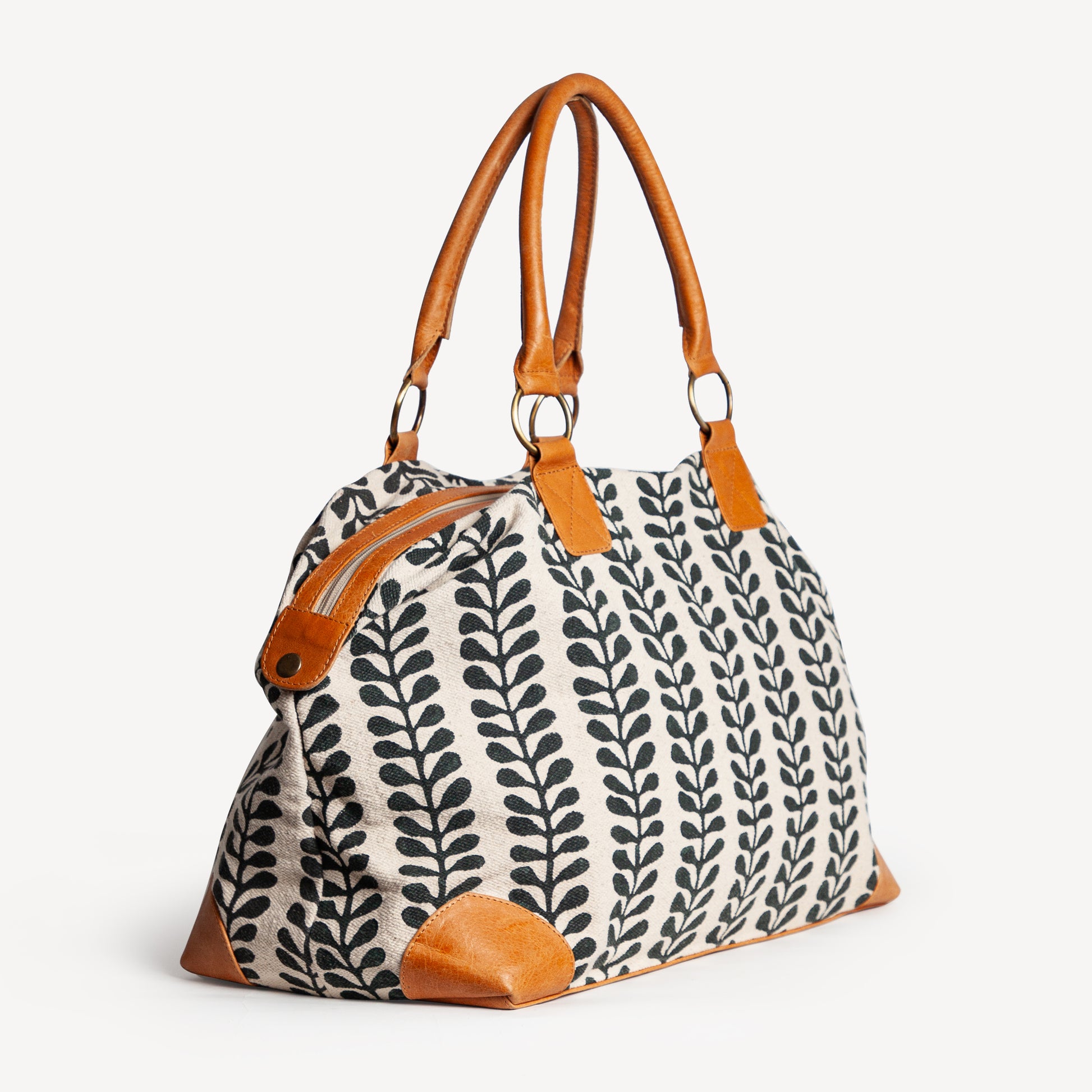 Materials: hand spun, hand woven cotton with recycled leather straps