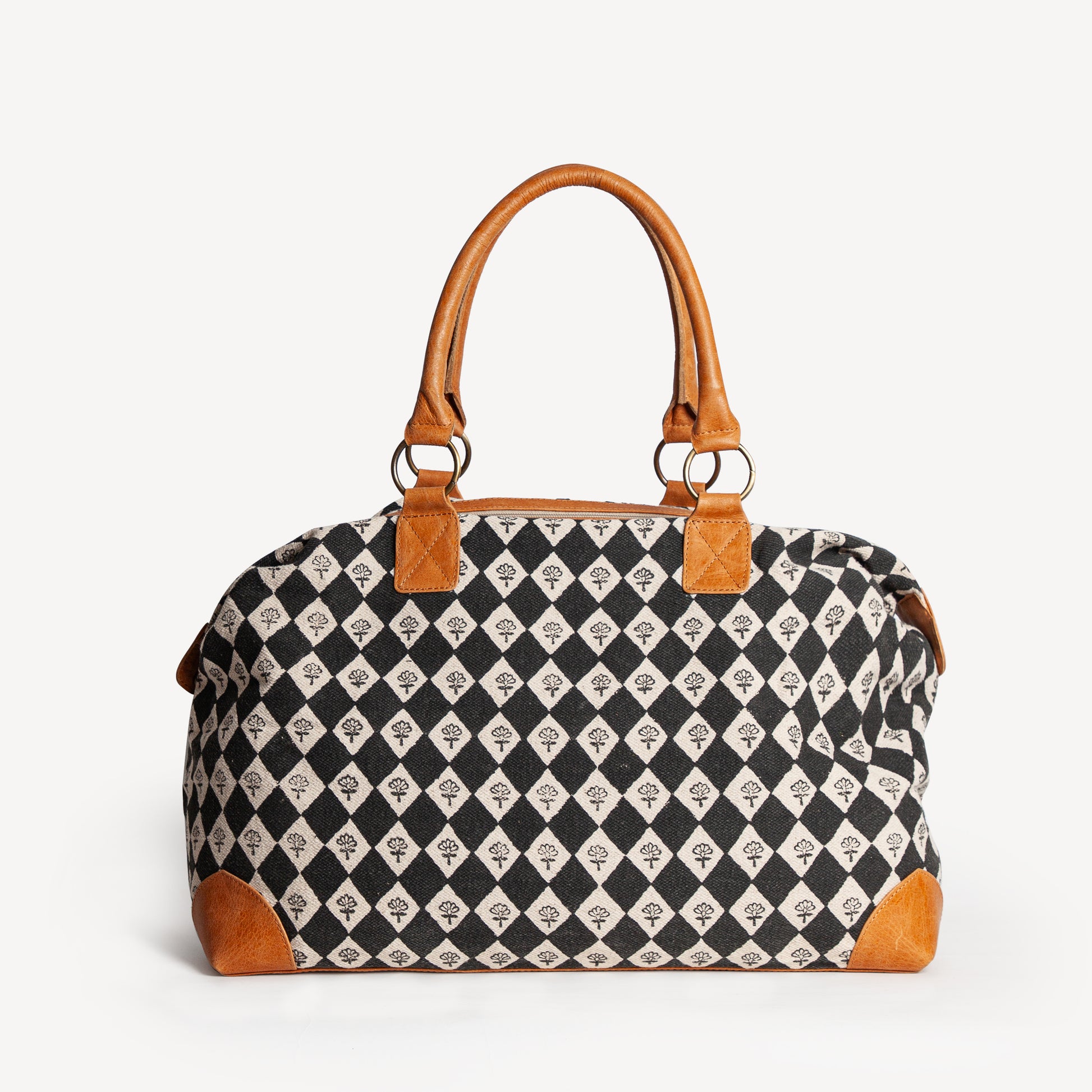 Materials: hand spun, hand woven cotton with recycled leather straps