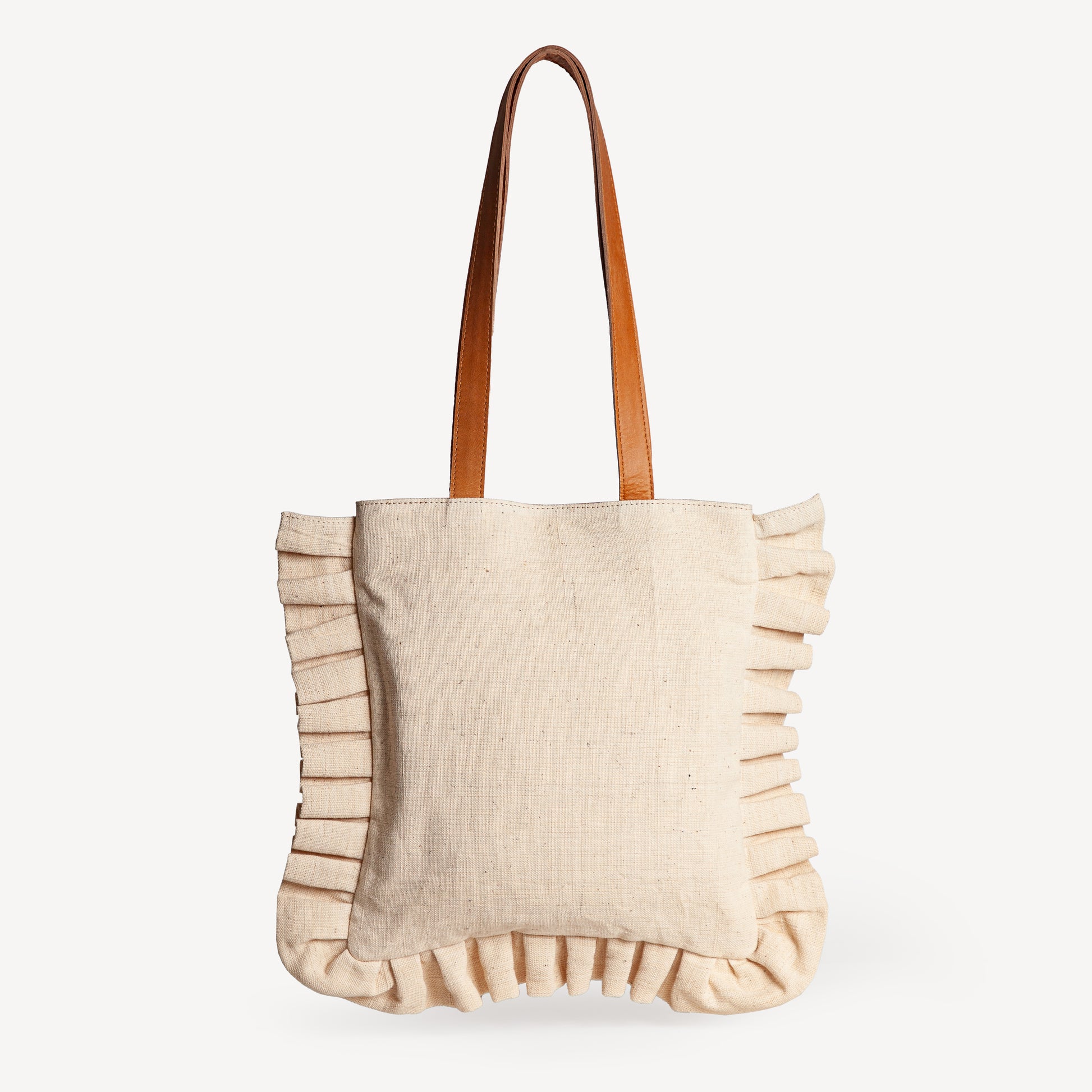 An easy to wear statement piece handmade from hand woven, block printed cotton canvas with frill detailing that reminds us of Momos; our favorite Nepali street food. Perfectly practical for everyday use, carrying all your essentials with a unique, playful twist.