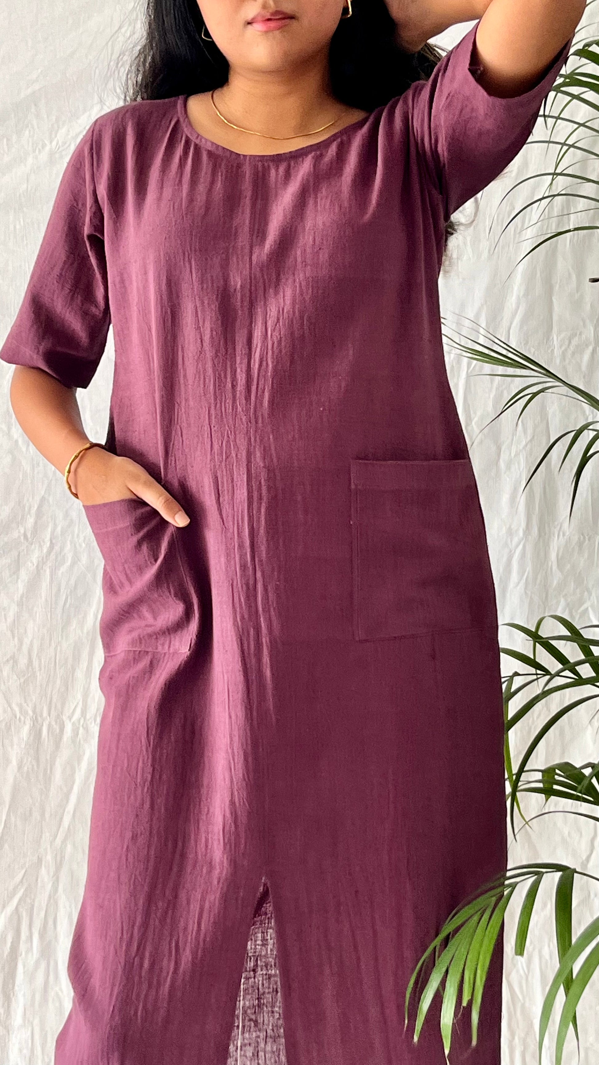 Step into subtle sophistication with our Mauve Kala Cotton A-line Dress, crafted from organic cotton. This eco-friendly piece features a timeless round neckline, two patch pockets for practicality, and a front slit that adds a modern edge to the design. The breathable kala cotton ensures comfort throughout the day, making it perfect for casual outings or relaxed gatherings.