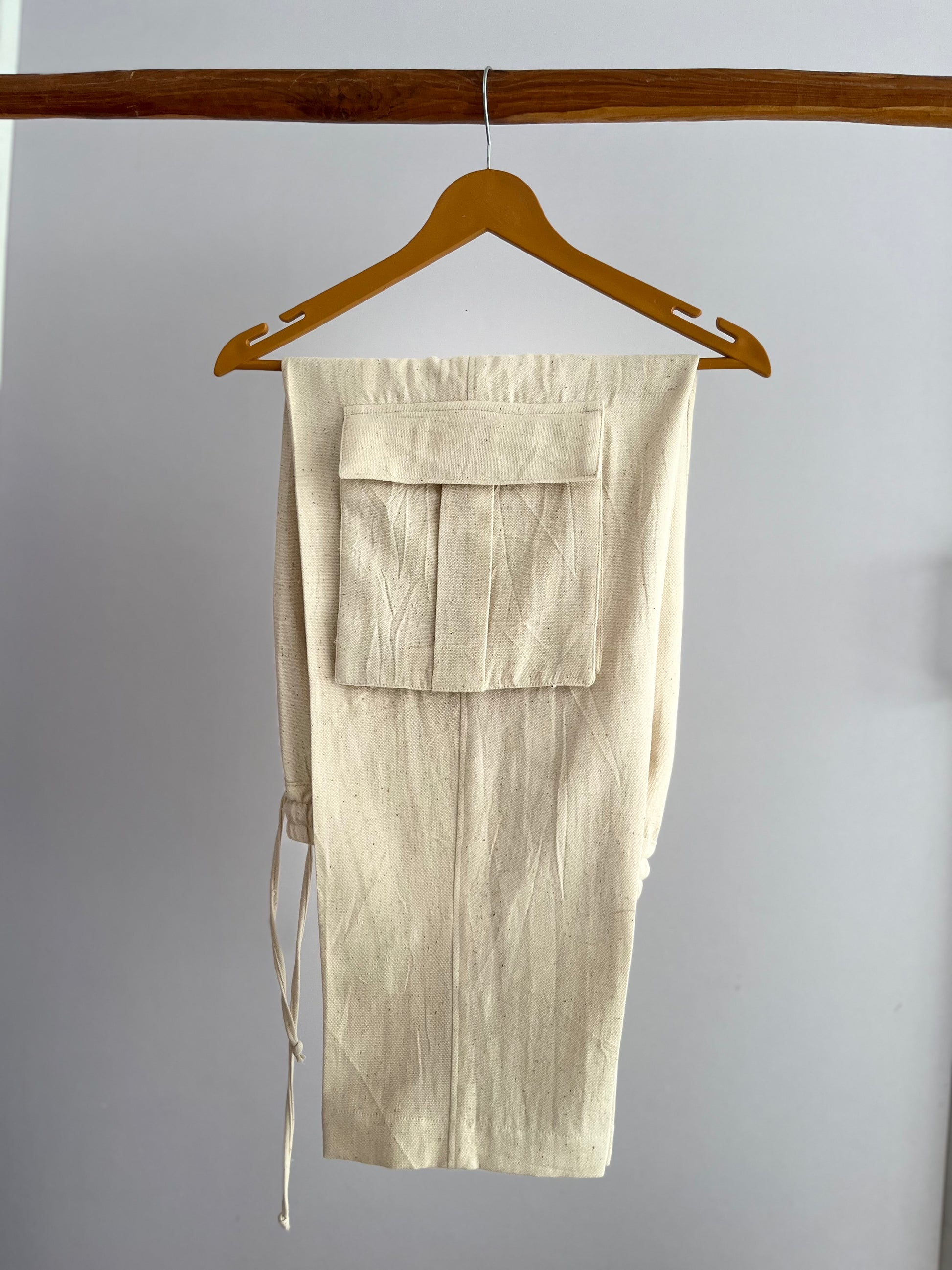 - Introducing our modern and effortlessly cool men's trousers "PureEase", crafted from sustainable Kala Cotton in a timeless off-white hue. Embrace comfort and style with its loose fit design, perfect for casual wear. The addition of box pockets adds both functionality and a contemporary touch to this classic piece. Whether you're running tasks or meeting friends for a weekend brunch, these trousers ensure both comfort and style.