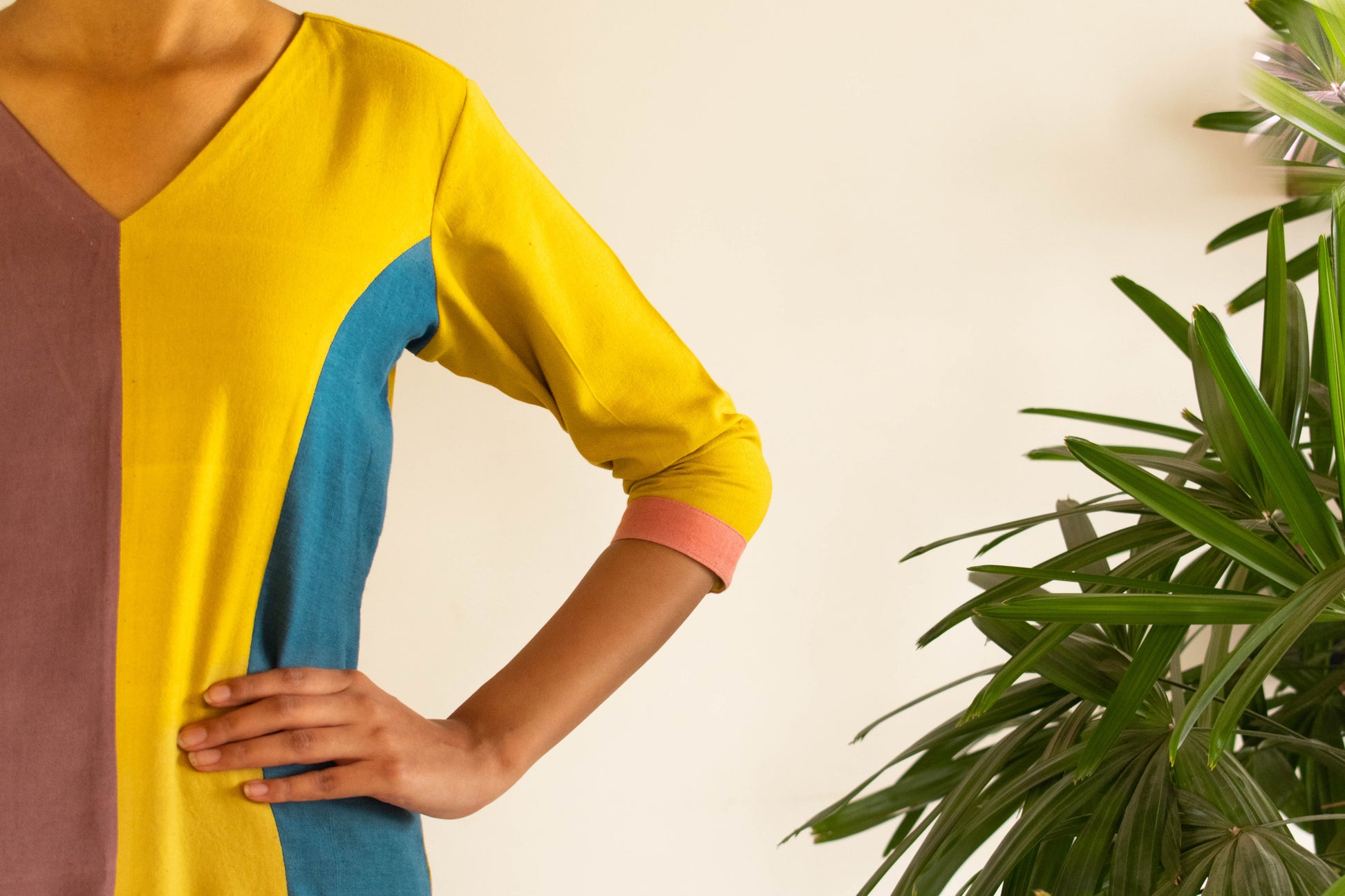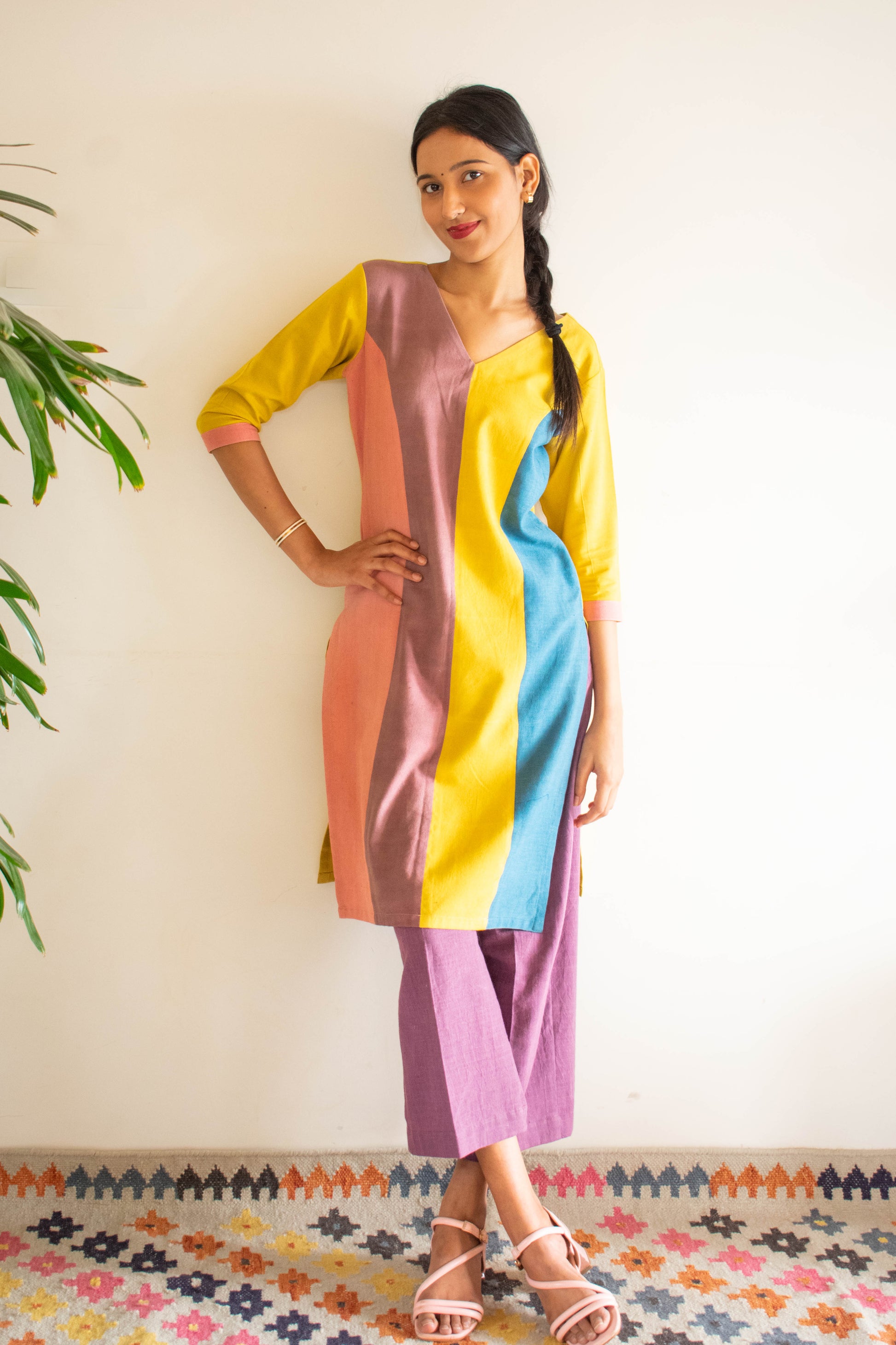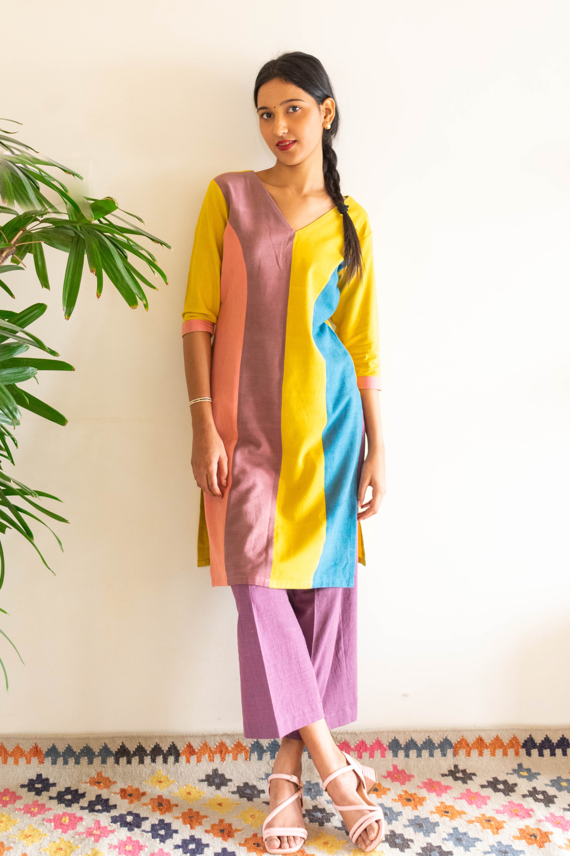 Add some color and comfort to your wardrobe with our Bamboo Rainbow Kurta. This kurta is made from organic handloom bamboo fabric, which is soft, breathable, and eco-friendly. The fabric features stripes of yellow, pink, blue and purple colors, creating a cheerful and vibrant look. The kurta has a V neck, three-quarter sleeves, and side slits for ease of movement. It can be paired with matching pants, leggings, or skirts for a casual or formal occasion. This kurta is a perfect choice for those who love natural and handcrafted products, as it showcases the skill and artistry of Indian weavers. Shop this kurta and more from Aadya Moda, a brand that celebrates India and its heritage with mindful and organic fashion.