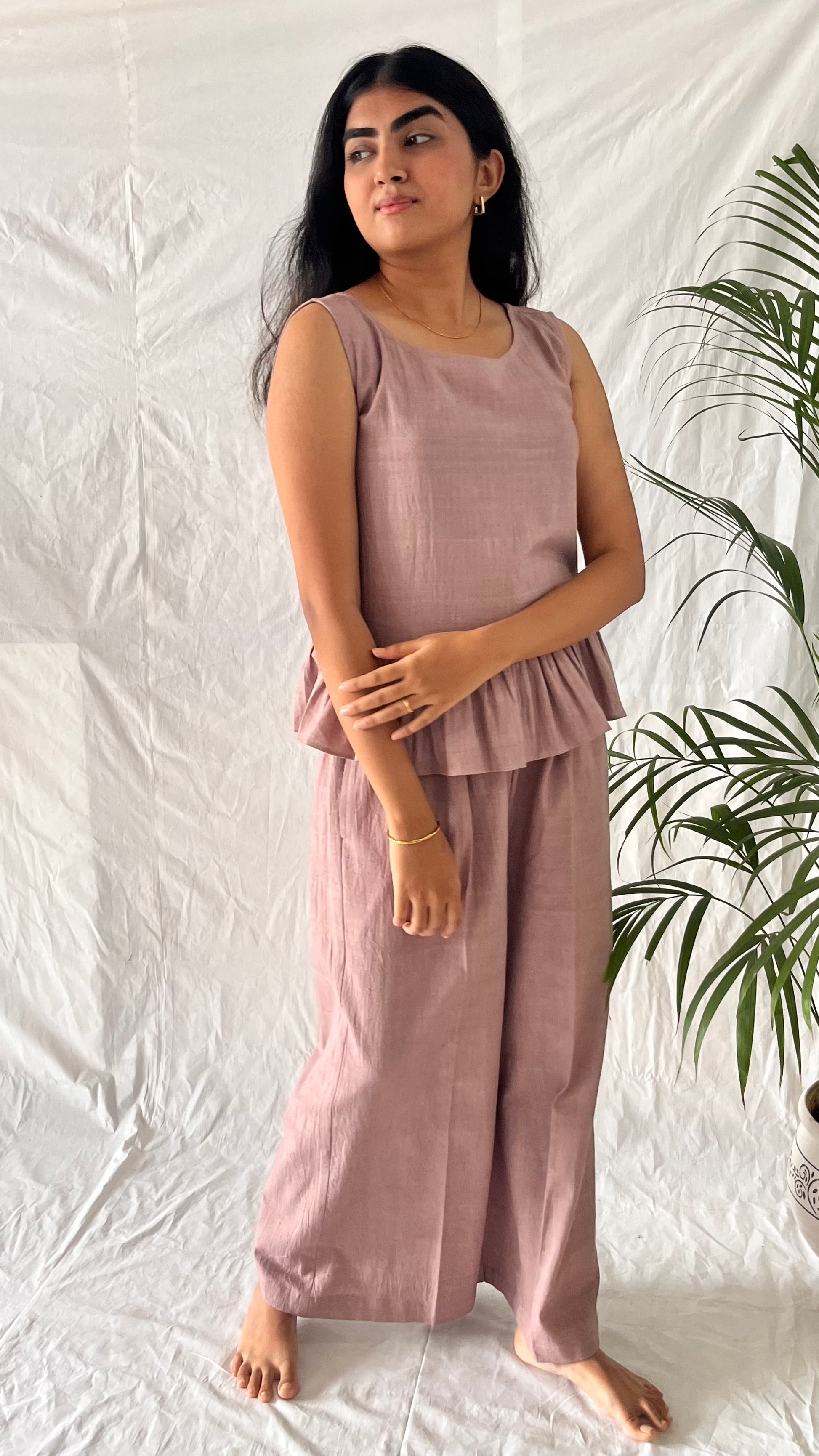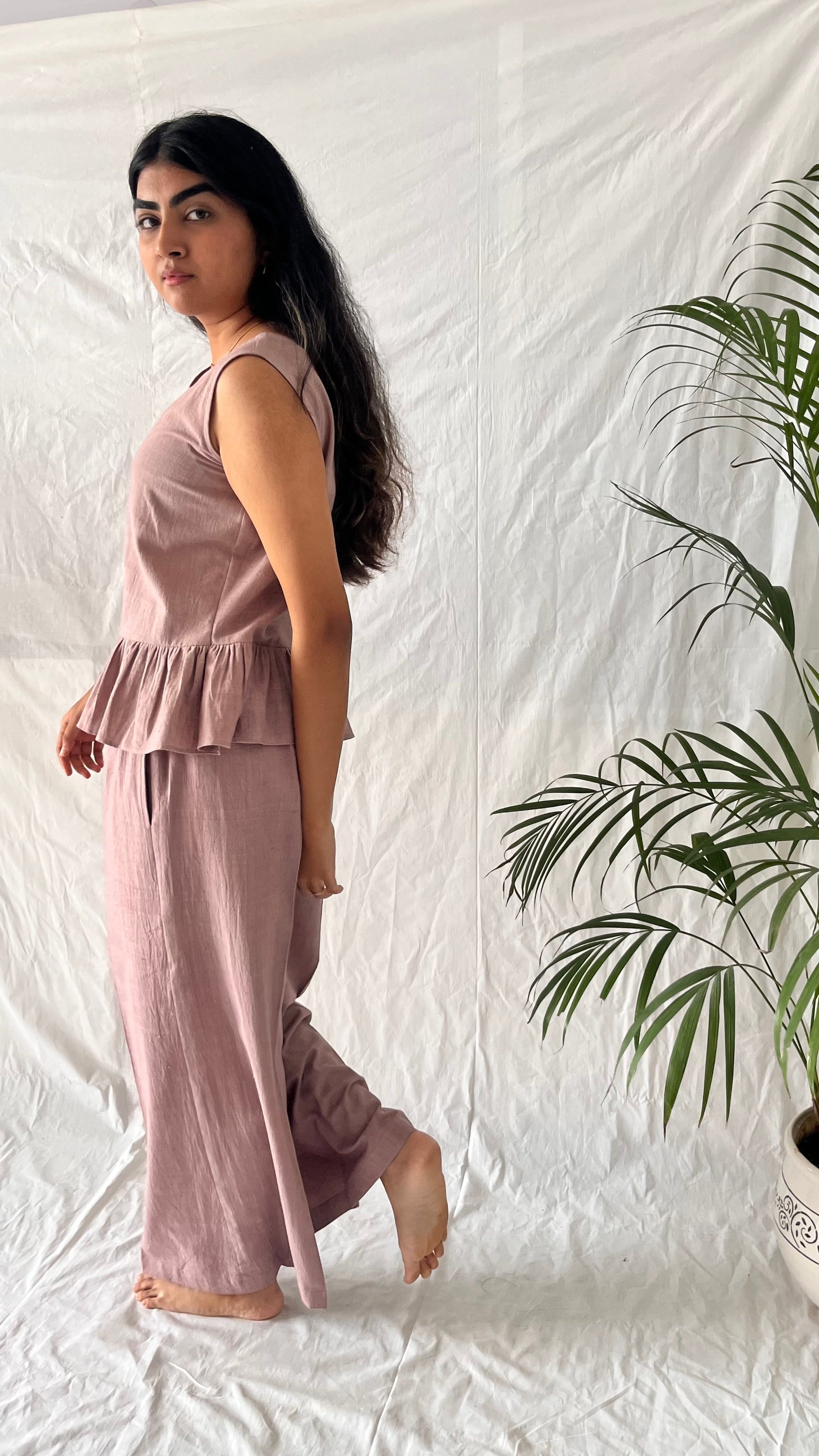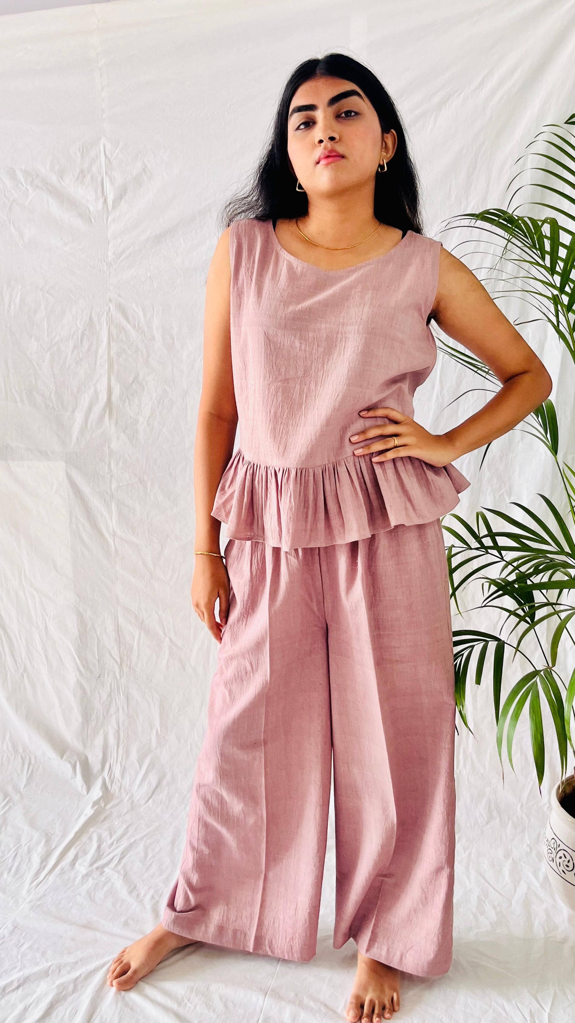 Light purple Coord Set, crafted from organic kala cotton. This ensemble features a sleeveless top with delicate frills at the hem, adding a subtle yet stylish flare to your look. The matching bottom offers a comfortable fit, perfect for all-day wear. This coord set blends ethical fashion with chic design, ensuring you feel good about your wardrobe choices. Ideal for casual outings or relaxed workdays, it's a must-have for anyone who values both comfort and conscious fashion.