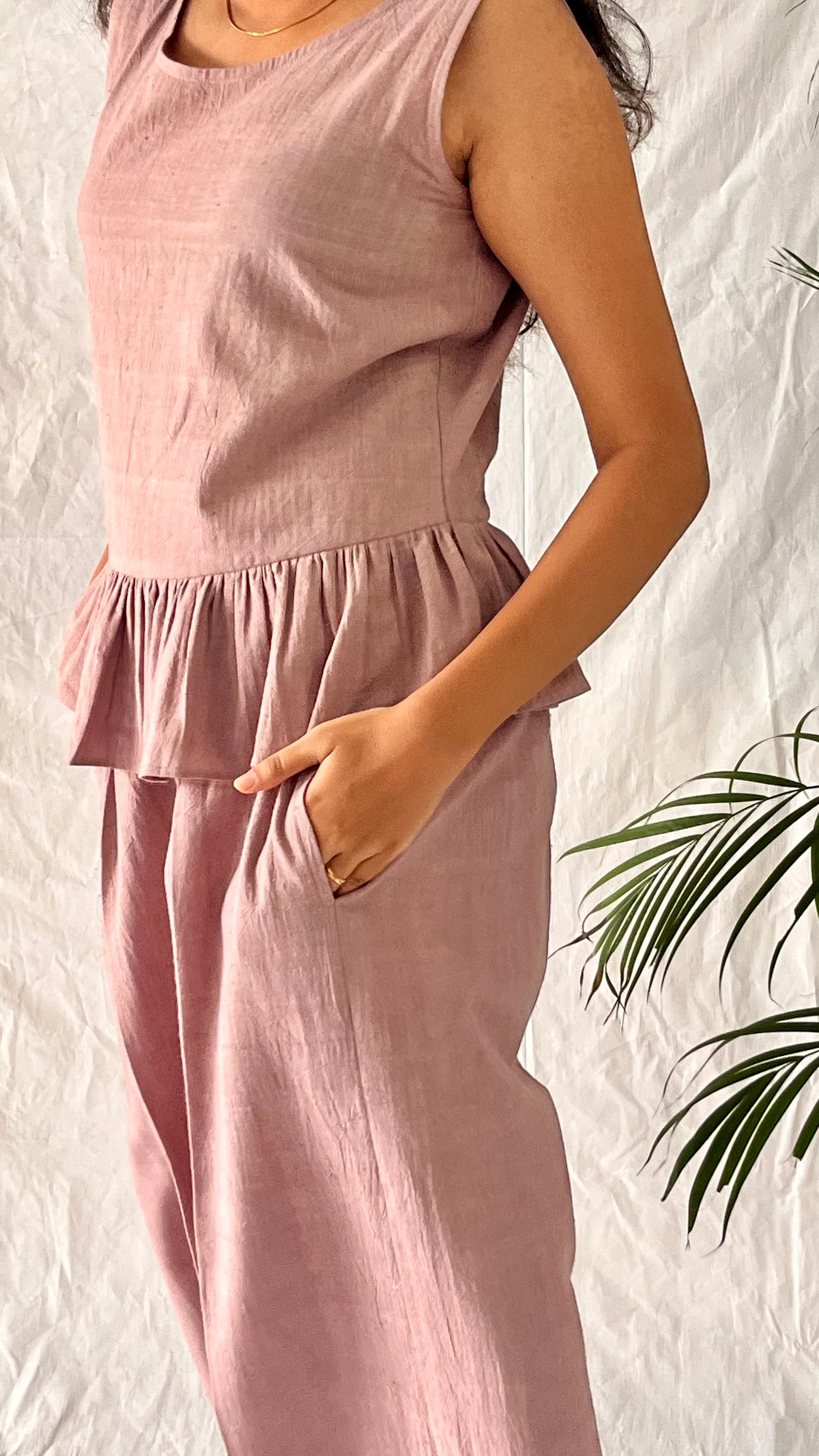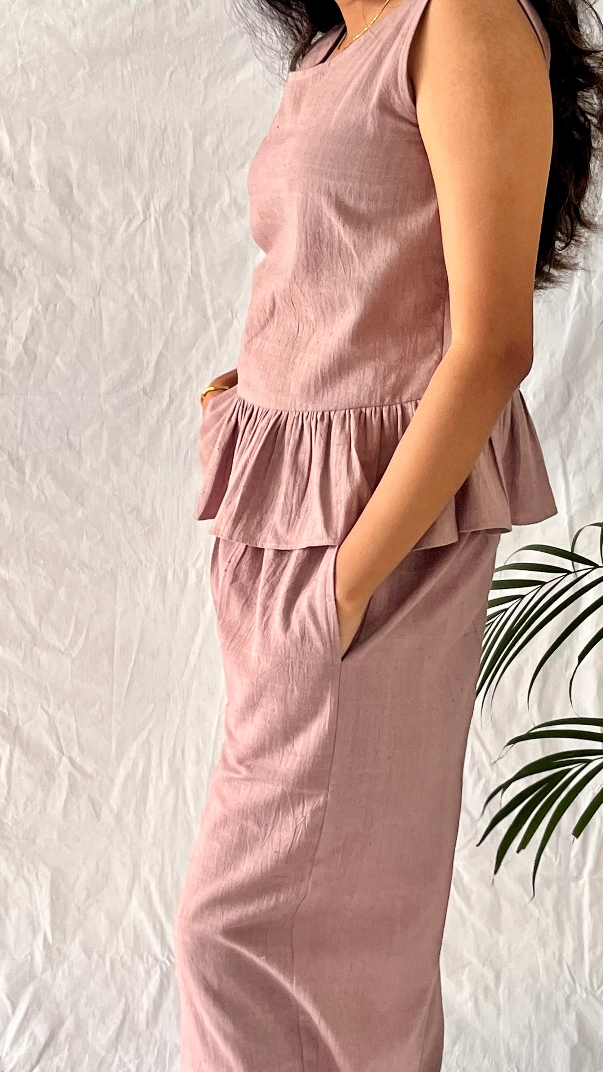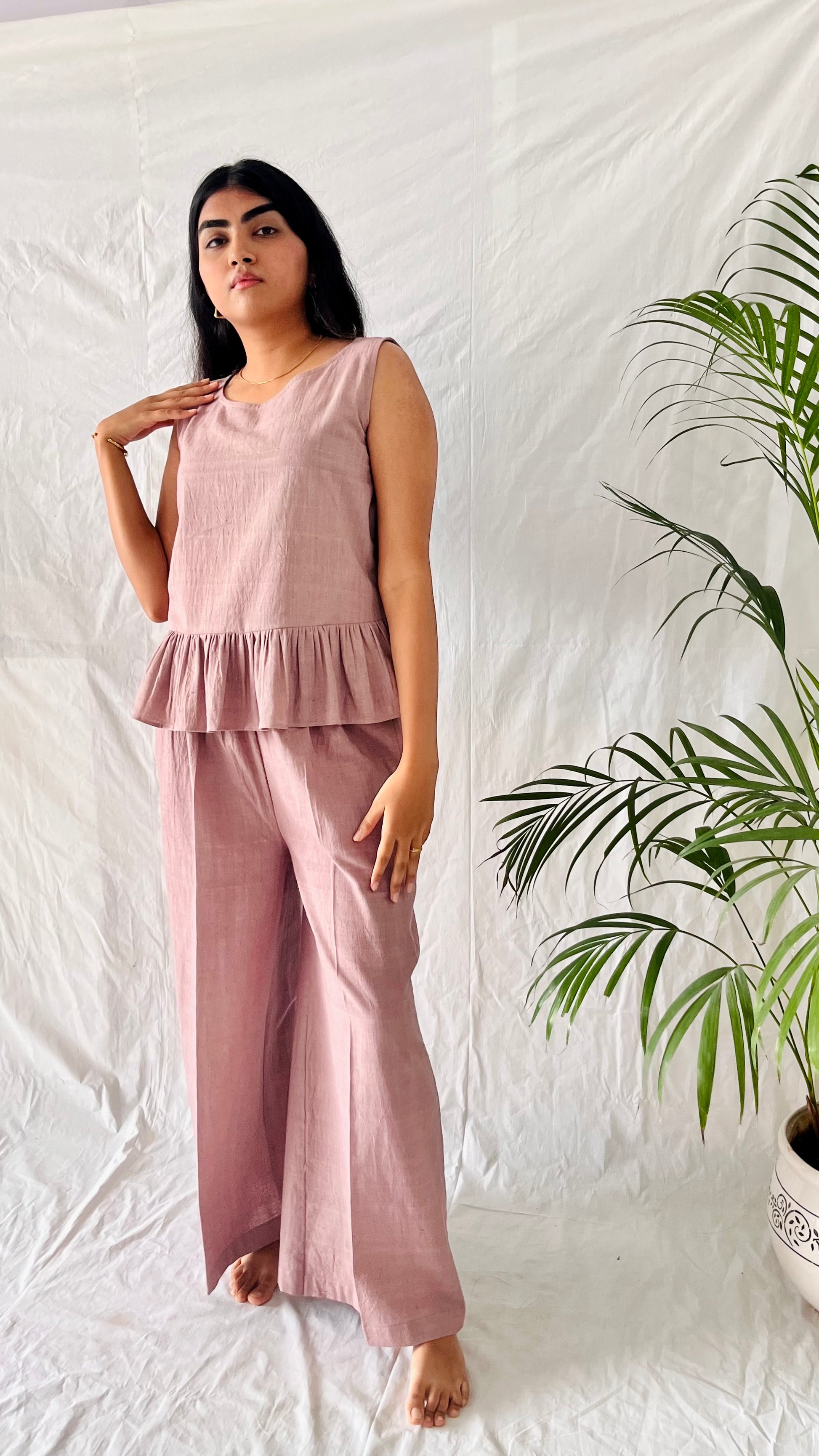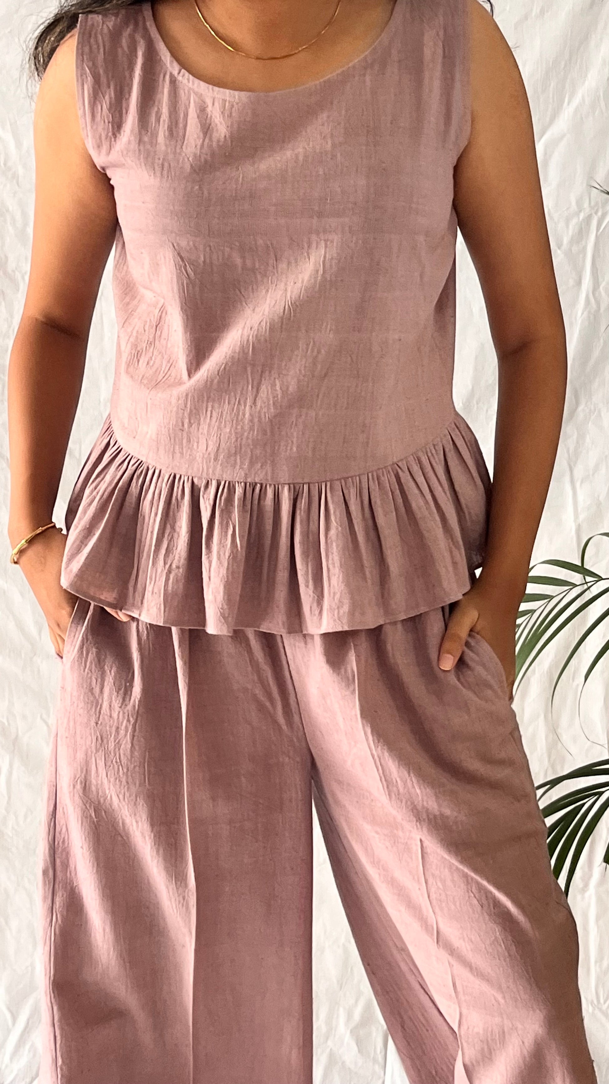 Light purple Coord Set, crafted from organic kala cotton. This ensemble features a sleeveless top with delicate frills at the hem, adding a subtle yet stylish flare to your look. The matching bottom offers a comfortable fit, perfect for all-day wear. This coord set blends ethical fashion with chic design, ensuring you feel good about your wardrobe choices. Ideal for casual outings or relaxed workdays, it's a must-have for anyone who values both comfort and conscious fashion.