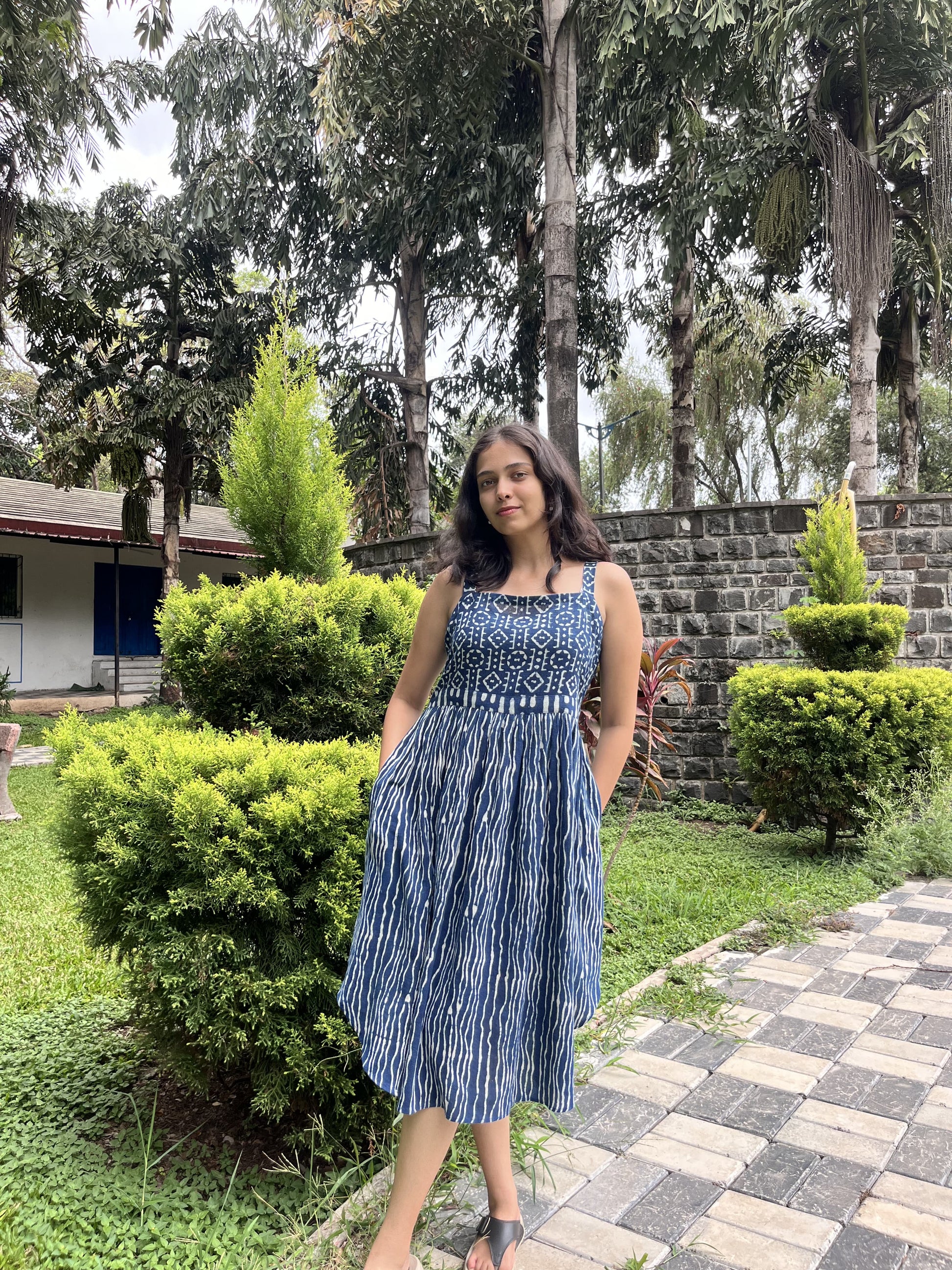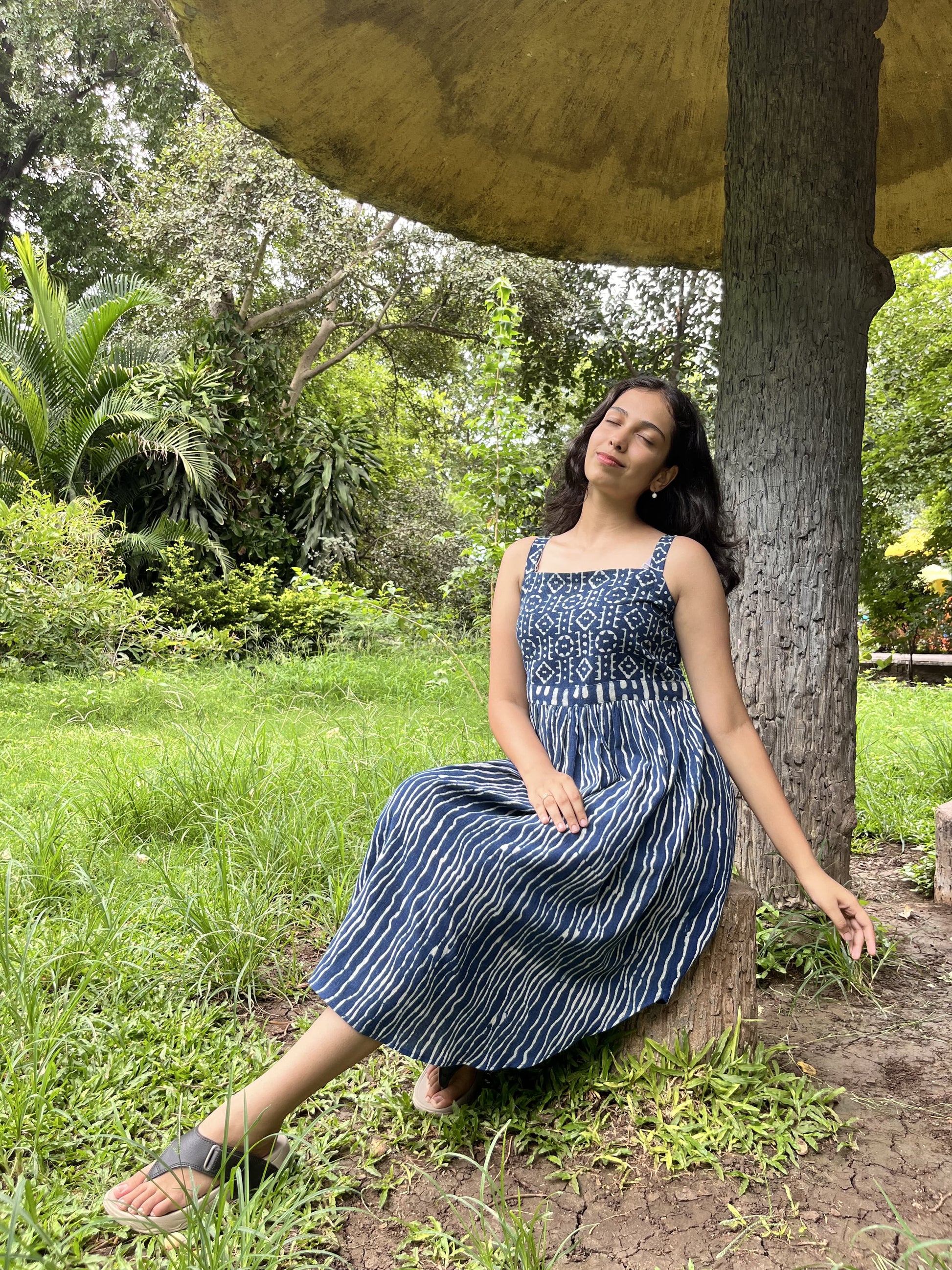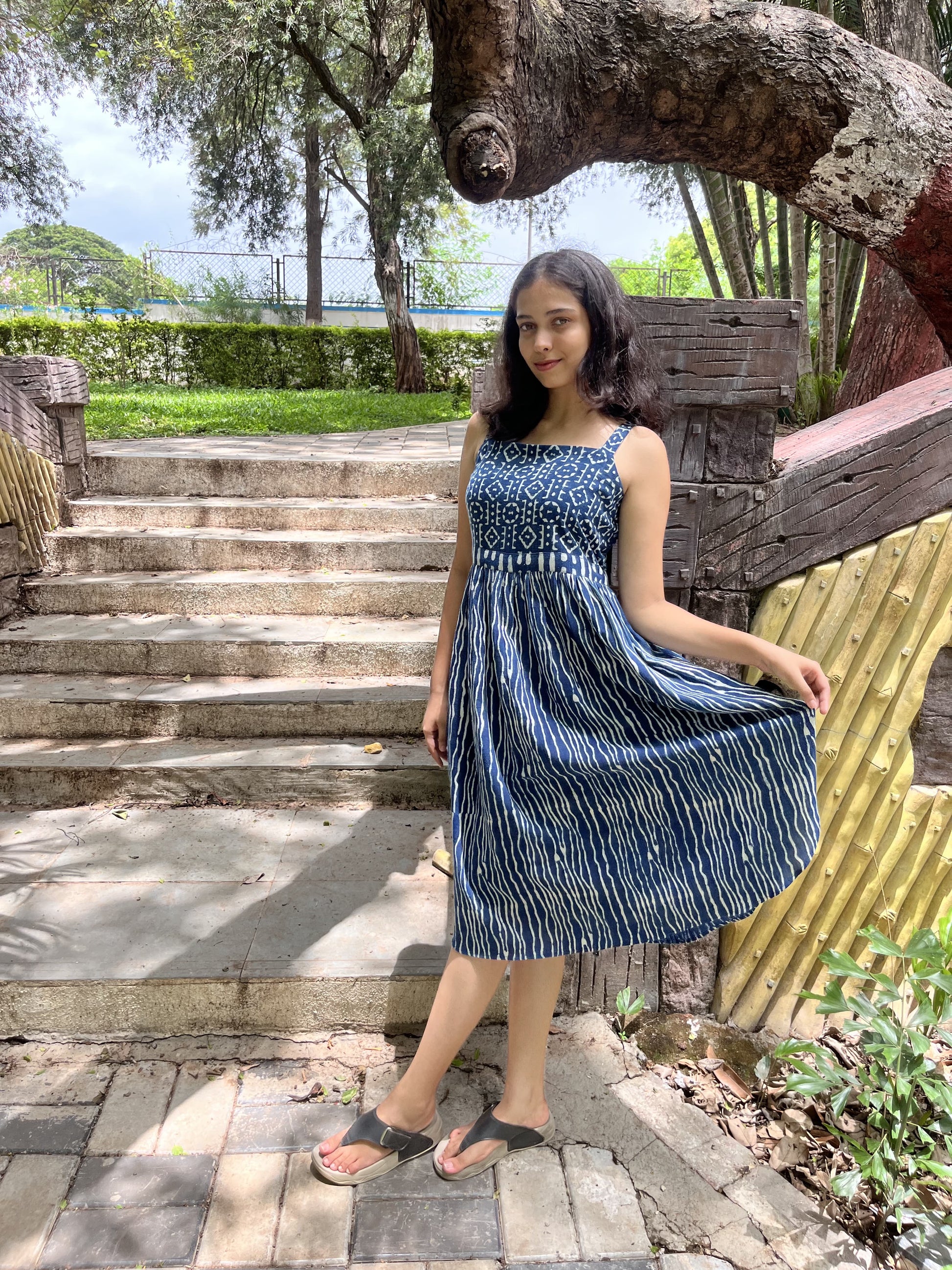 Elevate your daily wear wardrobe with our Indigo Elegance Yoke Dress, made with all sustainable dyes and premium kala cotton. White Dabu prints, known for their traditional hand-blocked patterns, adorn the fabric, giving the dress a distinctive ethnic touch. The side curve cut adds a modern twist to the traditional design, offering both style and comfort. The dress is complemented with a yoke that enhances its elegance. This sleeveless dress is Ideal for casual outings. It combines cultural richness with contemporary fashion, making it a versatile addition to your collection.