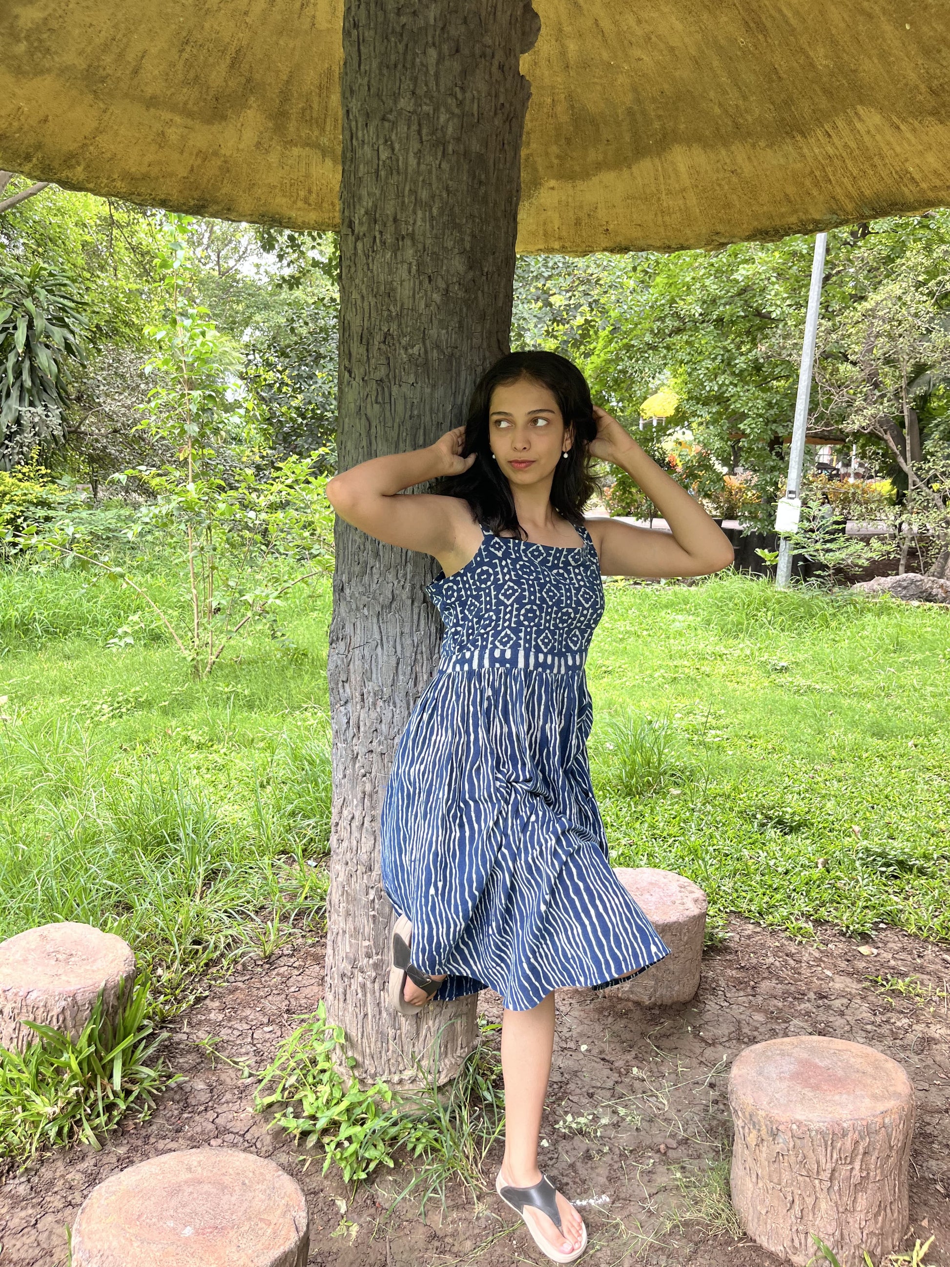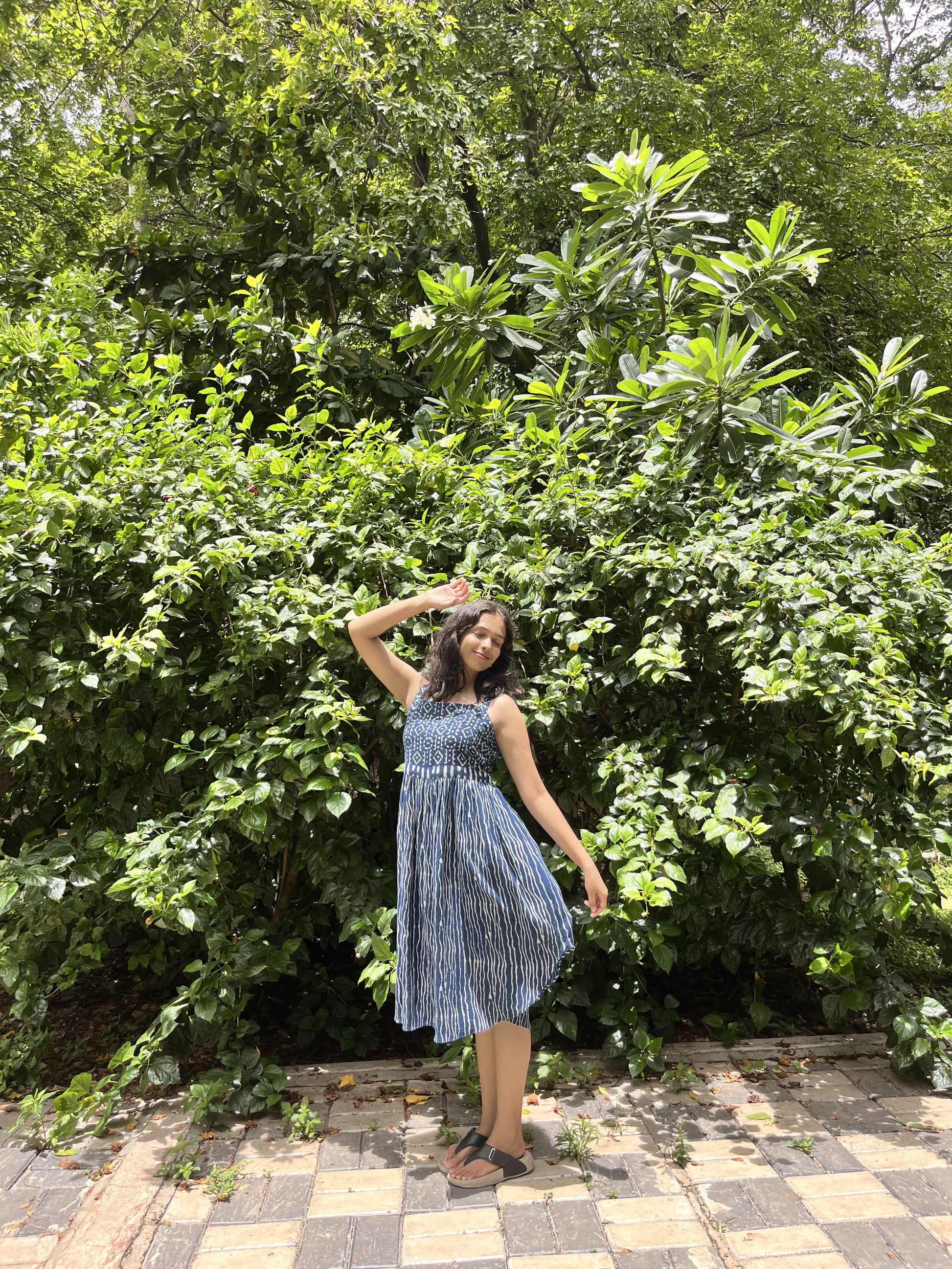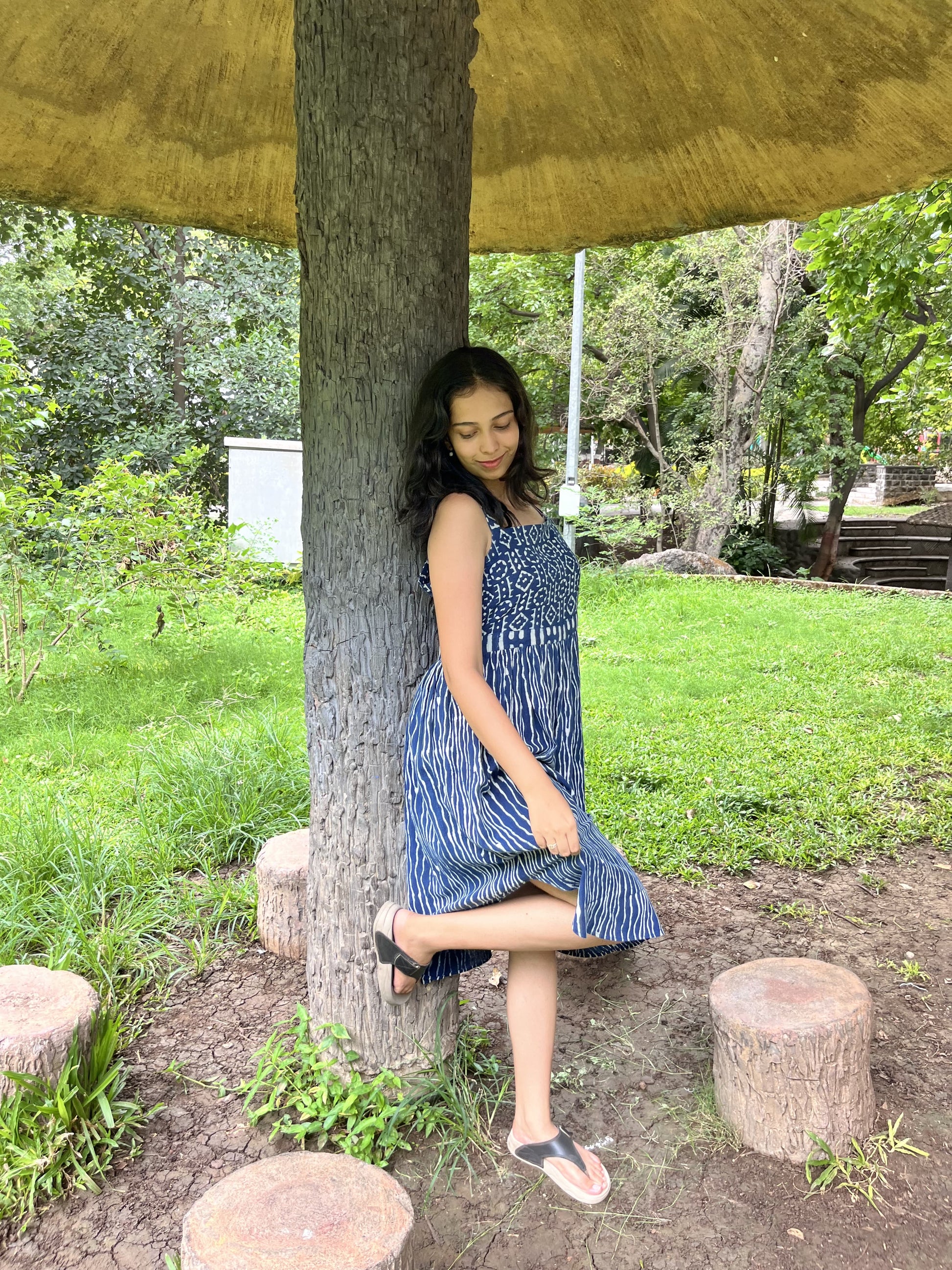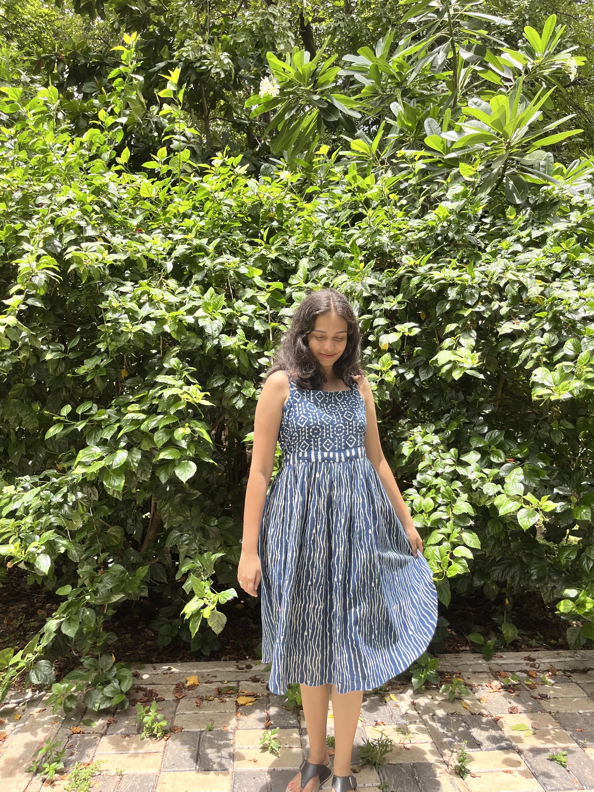 Elevate your daily wear wardrobe with our Indigo Elegance Yoke Dress, made with all sustainable dyes and premium kala cotton. White Dabu prints, known for their traditional hand-blocked patterns, adorn the fabric, giving the dress a distinctive ethnic touch. The side curve cut adds a modern twist to the traditional design, offering both style and comfort. The dress is complemented with a yoke that enhances its elegance. This sleeveless dress is Ideal for casual outings. It combines cultural richness with contemporary fashion, making it a versatile addition to your collection.