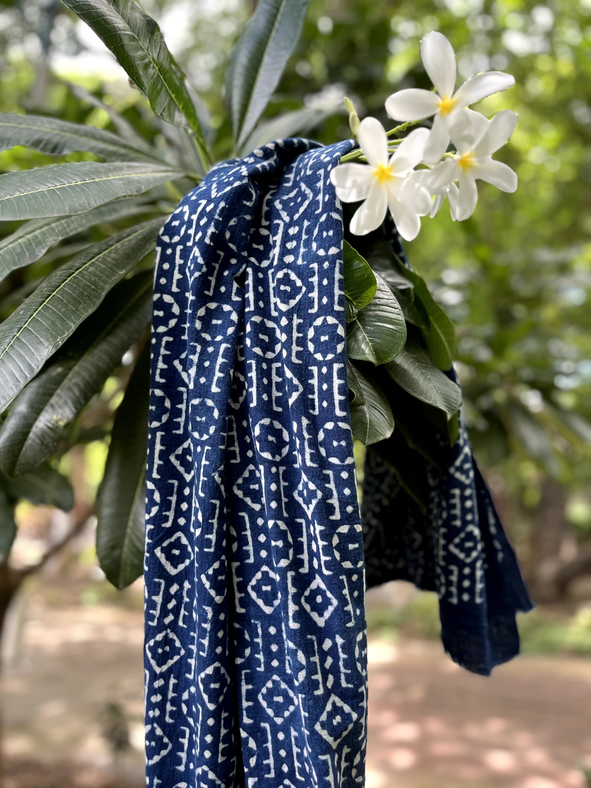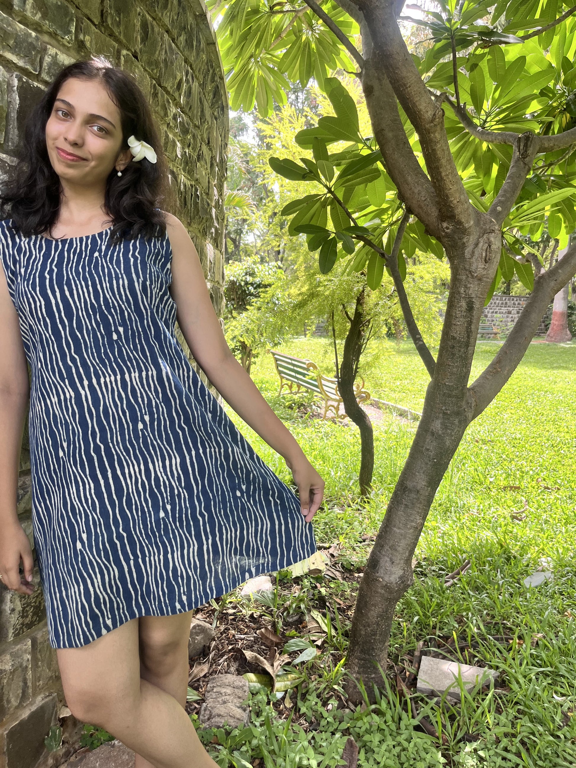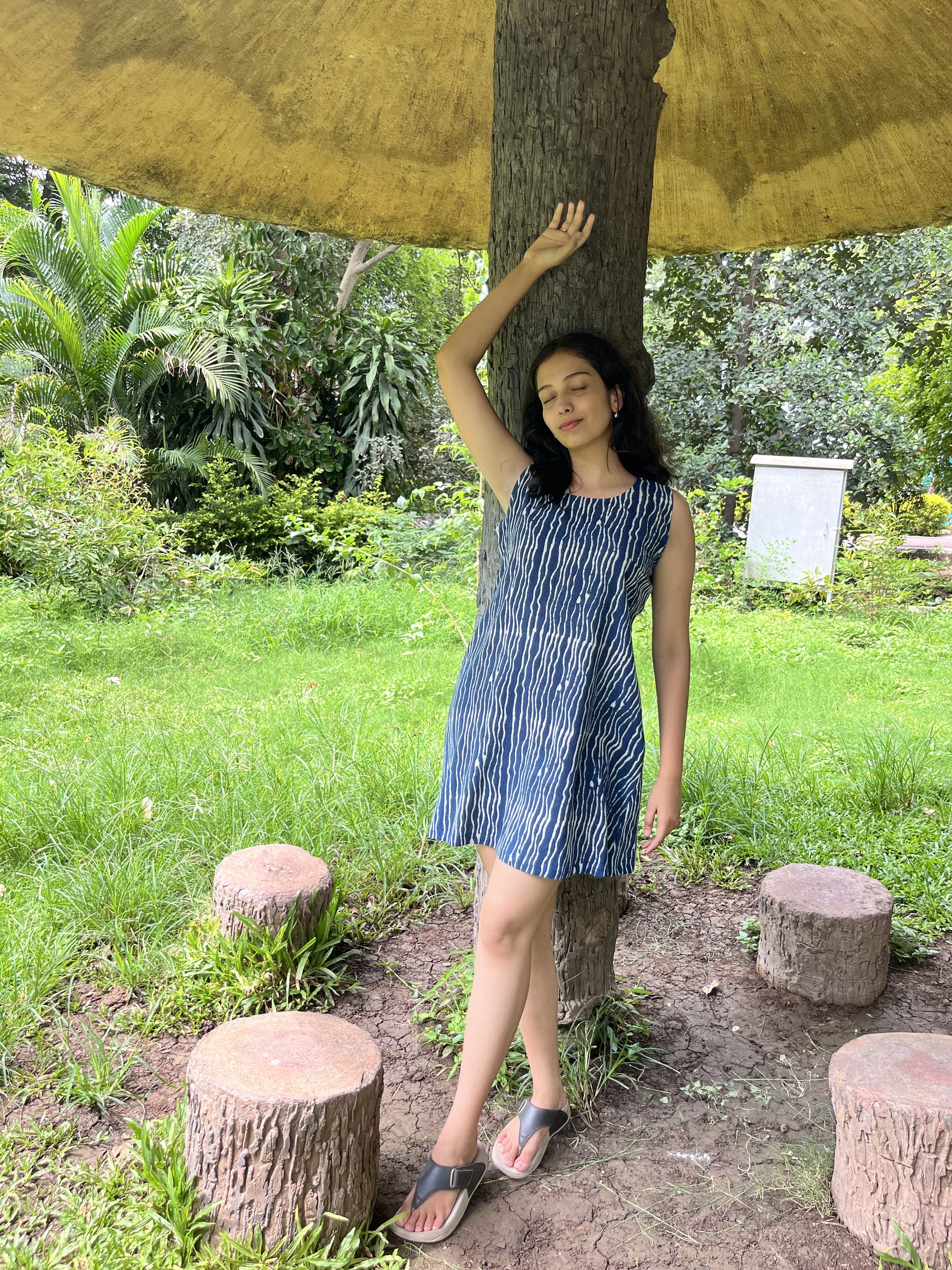 Elevate your daily wardrobe with the Indigo Delight dress. Crafted from premium Kala cotton, this thigh-length, sleeveless dress is the embodiment of sustainable fashion. The vibrant indigo blue, created using eco-friendly dyes, is adorned with charming white dabu prints making it perfect for casual, everyday wear. The round neckline adds a touch of simplicity and elegance, ensuring comfort and style. Embrace a sustainable lifestyle with the Indigo Delight dress, where eco-consciousness meets effortless chic.