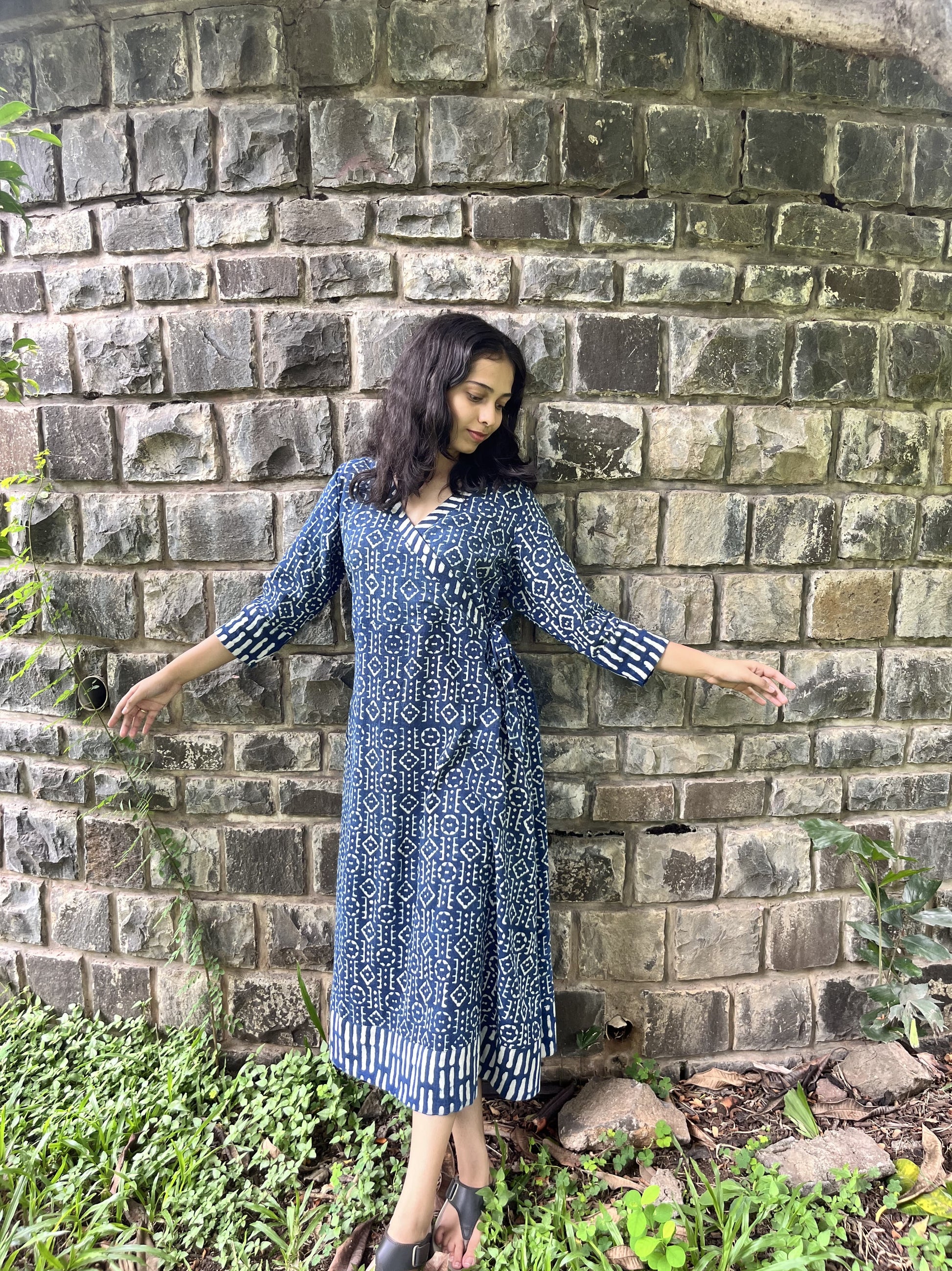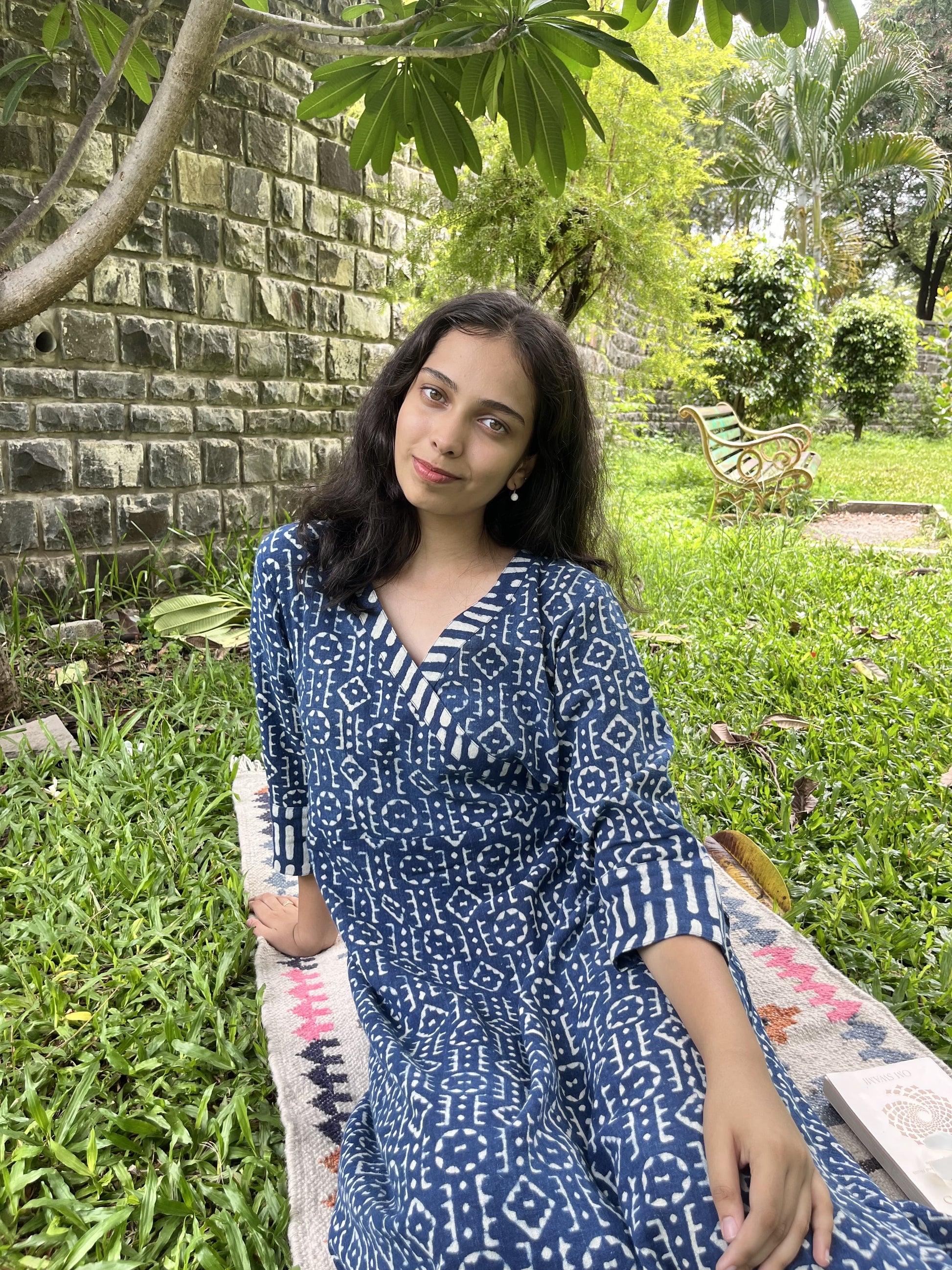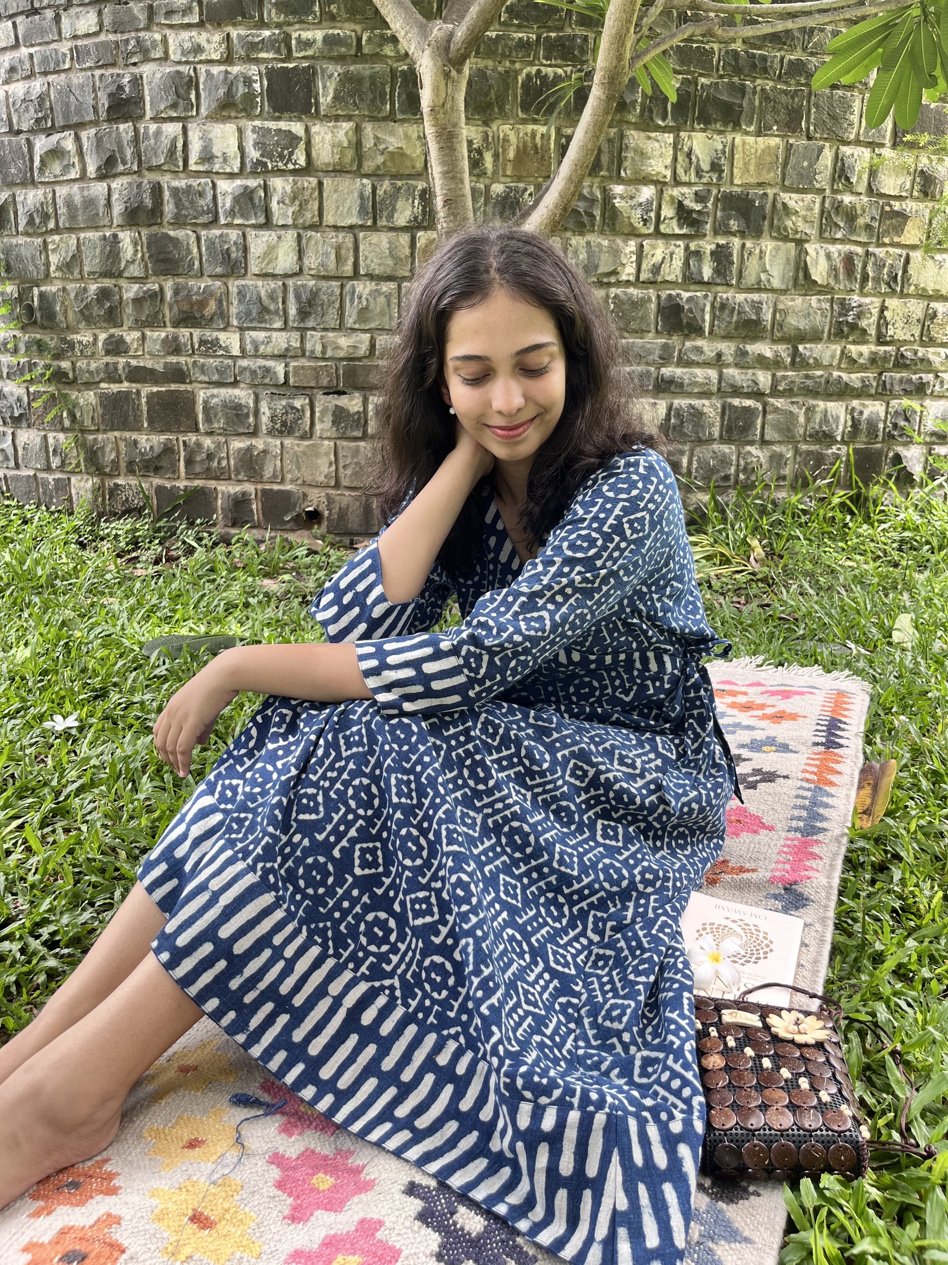 Embrace sustainable fashion with our Indigo Eco-Chic Kurta. Crafted from premium Kala cotton, this kurta is a testament to eco-friendly elegance. The rich indigo blue hue, achieved with natural, eco-friendly dyes, is beautifully complemented by offering a timeless aesthetic. Featuring long sleeves and a stylish V-neck, this kurta is designed for comfort and sophistication.The dress is beautifully detailed with white Dabu prints. The side tie-up detail adds a unique touch, ensuring a perfect fit. Perfect for the environmentally conscious, this kurta embodies the essence of sustainable living while keeping you stylish and comfortable.