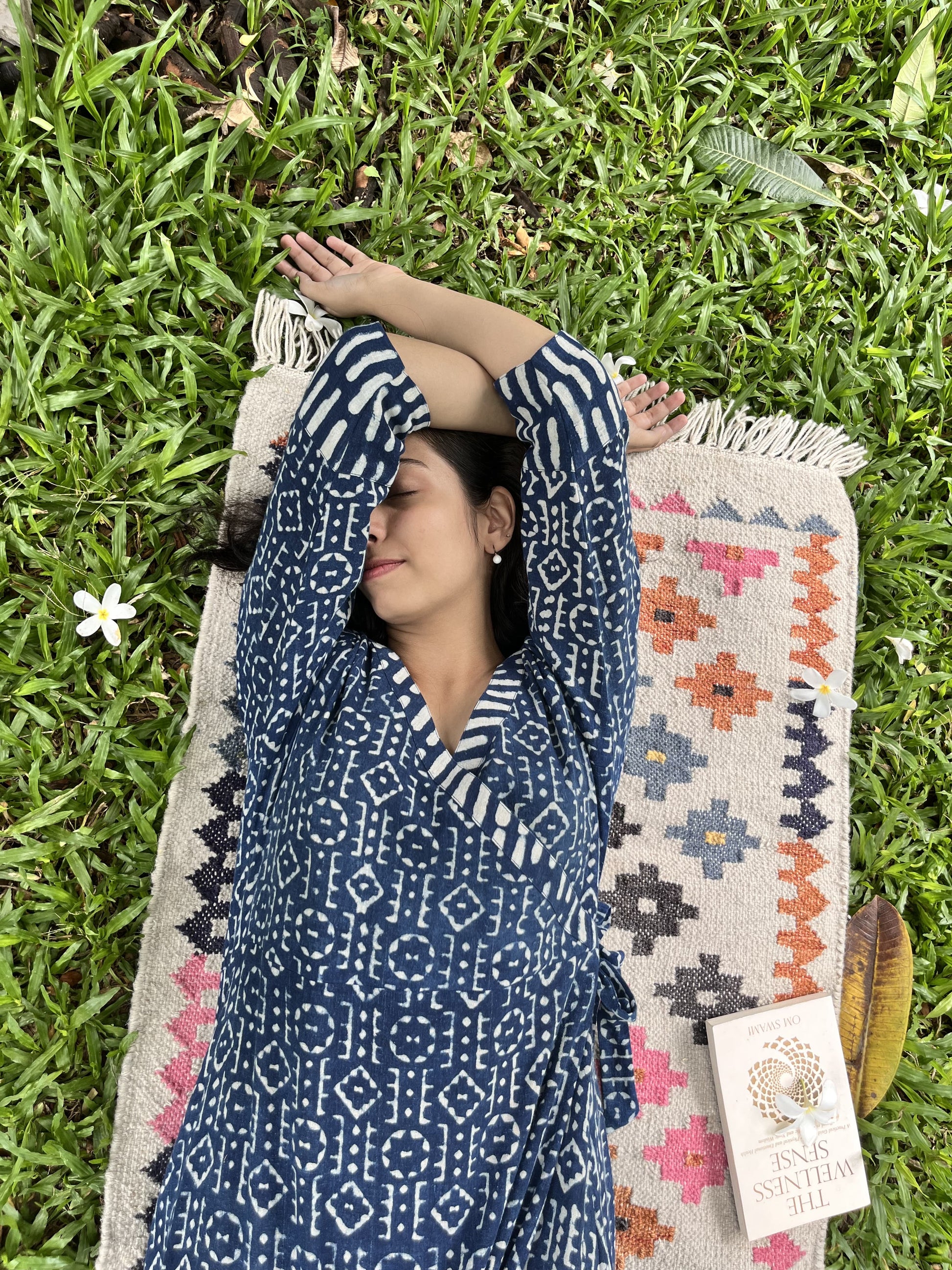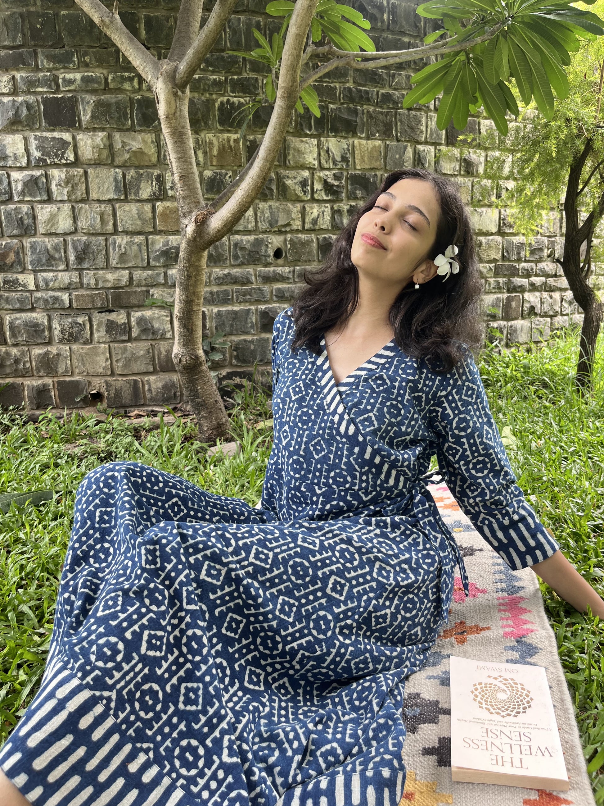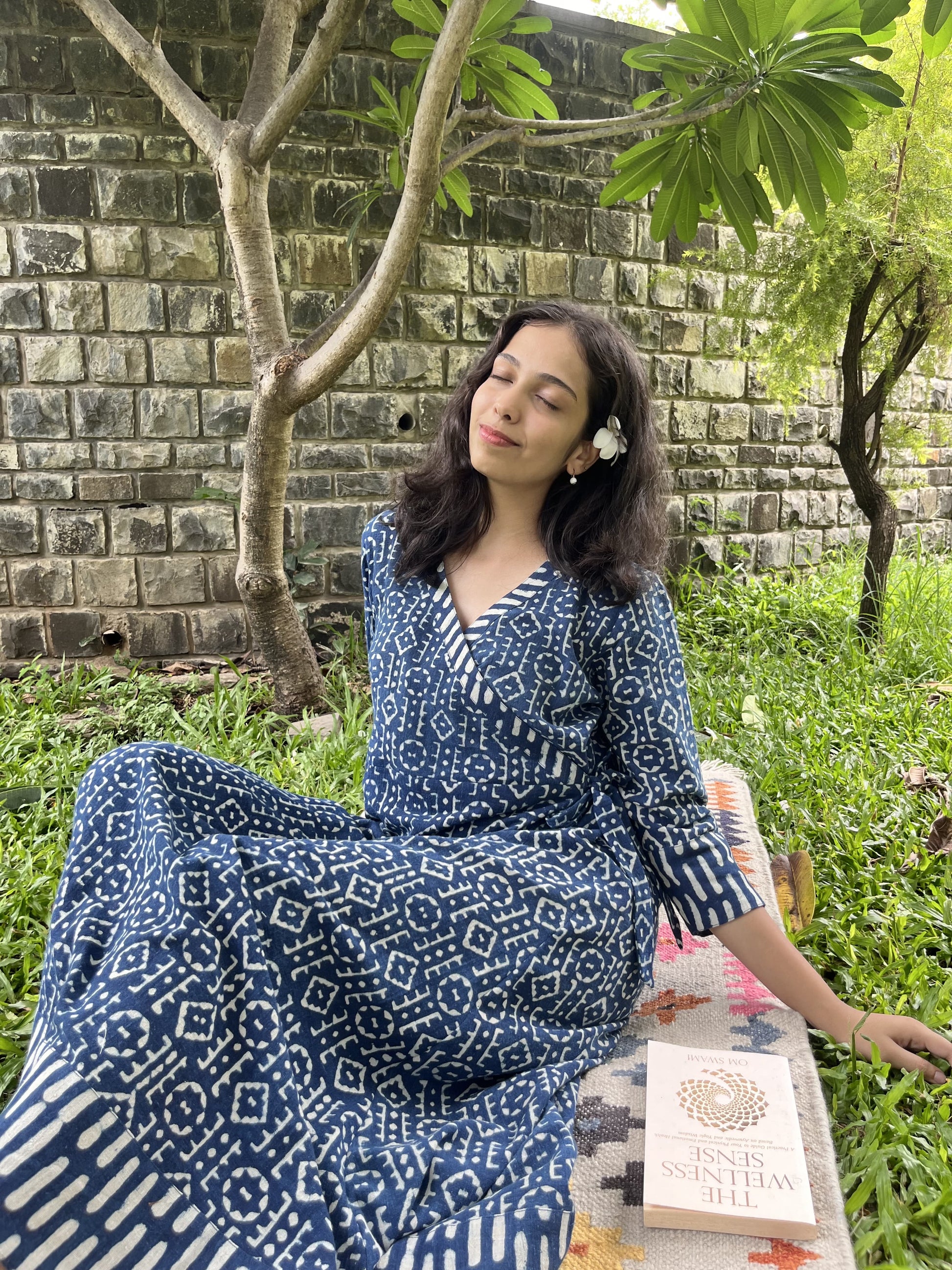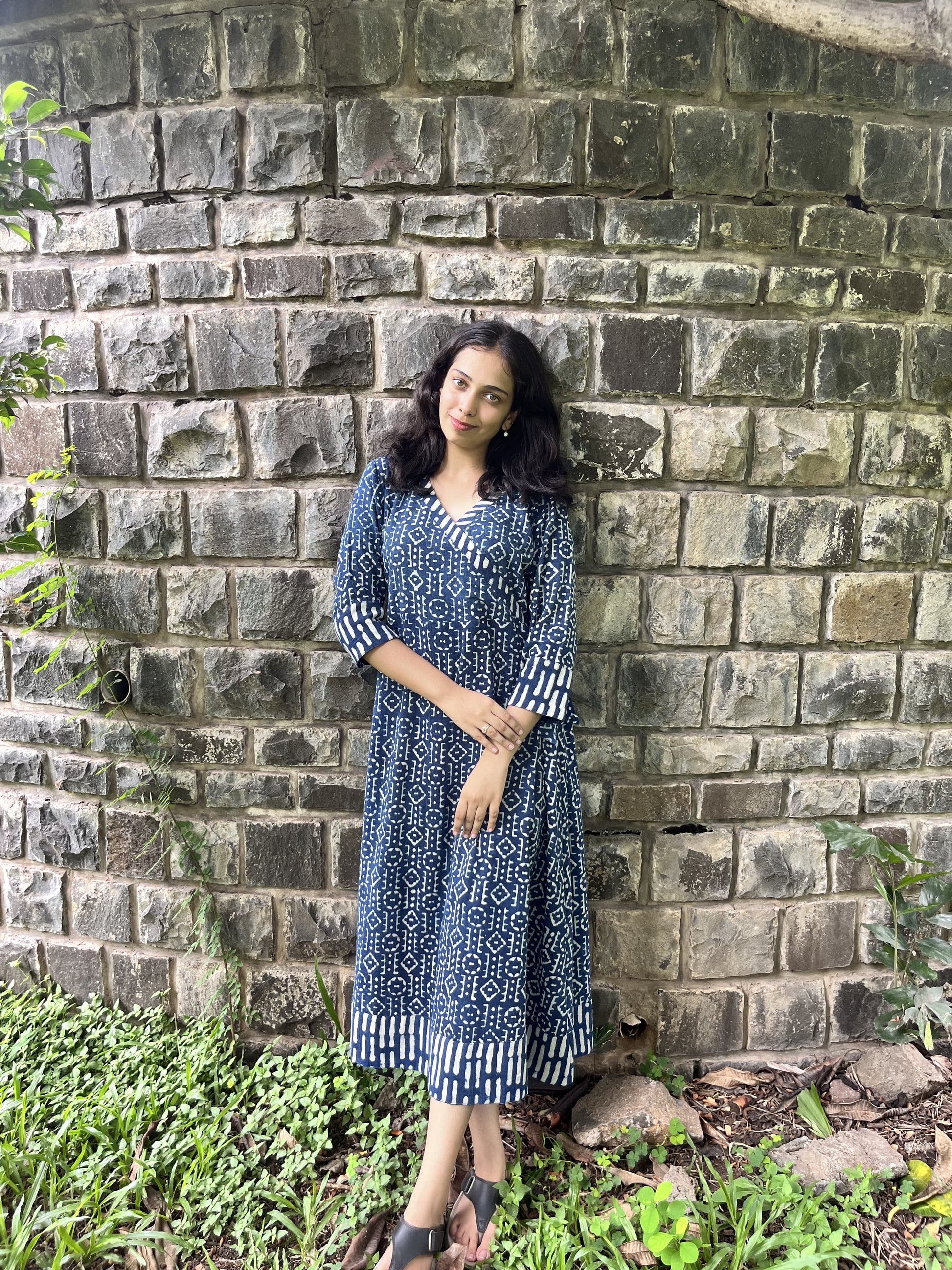 Embrace sustainable fashion with our Indigo Eco-Chic Kurta. Crafted from premium Kala cotton, this kurta is a testament to eco-friendly elegance. The rich indigo blue hue, achieved with natural, eco-friendly dyes, is beautifully complemented by offering a timeless aesthetic. Featuring long sleeves and a stylish V-neck, this kurta is designed for comfort and sophistication.The dress is beautifully detailed with white Dabu prints. The side tie-up detail adds a unique touch, ensuring a perfect fit. Perfect for the environmentally conscious, this kurta embodies the essence of sustainable living while keeping you stylish and comfortable.